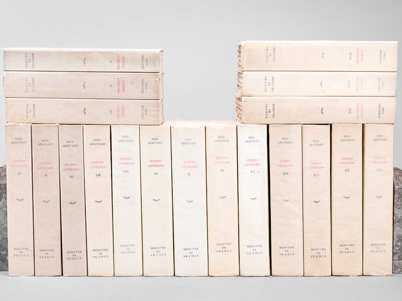 Un des 300 exemplaires sur vélin de Rives (puis sur Vélin Johannot à partir du tome 8), non numéroté, 19 vol. in-8 brochés sous couv. rempliée, Mercure de France, Paris, 1954-1966 Bel exemplaire du tirage en grand papier (après 30 exemplaires sur vélin de Madagascar), en parfait état, recueillant l'oeuvre majeure de Paul Léautaud (1872-1956). En plus de 6000 pages, il évoque ses relations amoureuses orageuses avec Anne Cayssac dite "Le Fléau", ses nombreux animaux de compagnie, mais aussi tout le monde littéraire croisé dans les locaux du Mercure : Gide, Schwob, Colette, Jouhandeau, Cocteau, Drieu, Ernst Jünger, etc. Un très bel ensemble imprimé sur très beau papier vélin (Rives puis Johannot).