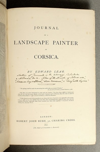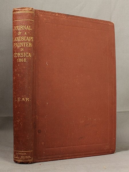 In-8ø; XVI, 272 pp., 1 carta geogr., 40 tavv. f.t., 40 illustrazioni nel testo, tutte incise in legno. Legatura editoriale in tutta tela rossa firmata da Bone & Son, Londra, titolo in oro al dorso e filetto impresso a secco ai piatti. Fioriture circoscritte solamente alle prime e ultime due carte. Bell'esemplare. Prima edizione. Libro di viaggio dedicato alla Corsica da Edward Lear, noto pittore, autore dei "Nonsense poems" e di altri giornali di viaggio in Calabria, Abruzzi e Albania. Il volume Š corredato da 40 tavole fuori testo e da altrettante figure nel testo da Badoureau, Pibaraude, P‚gard, Pinnemaier da disegni dell'autore, che raffigurano le diverse localit… visitate. Starace 556.