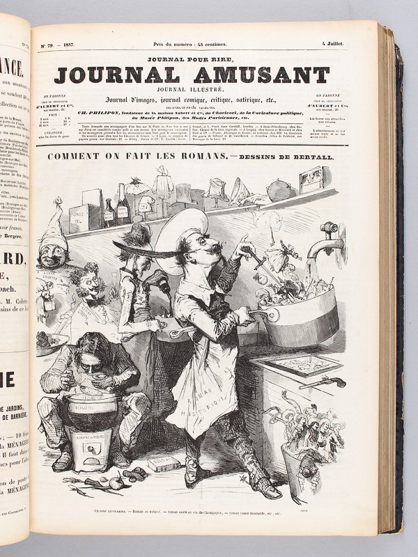 1 vol. in-folio reliure demi-basane noire, dos lisse orné en long, Le Journal Amusant, 56 numéros de 8 pages Rare ensemble bien complet des 56 numéros allant du 64 du 21 mars 1857 jusqu'au 119 du 10 avril 1858 (en fin de recueil, on trouve une partie des numéros 120 et 121). Etat très satisfaisant (dos lég. frotté, coupes frottées, mq. à un coin, très bon état intérieur par ailleurs). Avec les belles séries de caricatures de Bertall en couleurs. Hatin, 435