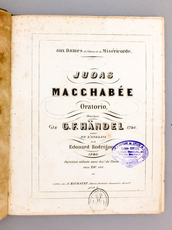 Judas Macchabée, oratorio. Musique de G.F. Händel 1746. Traduit de l'Anglais par Edouard Rodrigues 1846. Partition réduite avec Acct. de Piano. ( 9274. R. )