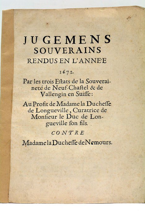 JUGEMENS SOUVERAINS rendus en l’année 1672 par les trois Estats de la Souveraineté de Neuf-Chastel et de Vallengin en Suisse : au profit de Madame la Duchesse de Longueville, Curatrice de Monsieur le Duc de Longueville son fils. Contre Madame la Duchesse de Nemours.