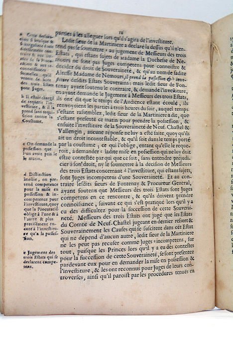34 pages. (1 feuillet blanc). (22,5x17 Cm). Non-relié. Dos renforcé. Rare mémoire juridique très rare, produit au sujet du différend né à la disparition du jeune Duc de Longueville (12 juin 1672) entre sa mère la Duchesse de Longueville, et la Duchesse de Nemours, souveraine de la principauté de Neuchâtel dont émane le présent jugement. Cette affaire mettait face à face deux des plus illustres figures féminines du XVIIs. : la Duchesse de Longueville, héroïne de la Fronde, était célèbre pour sa beauté et sa vie aventureuse ; la Duchesse de Nemours se fit surtout connaître par la publication de ses ‘Mémoires’. Bon exemplaire.