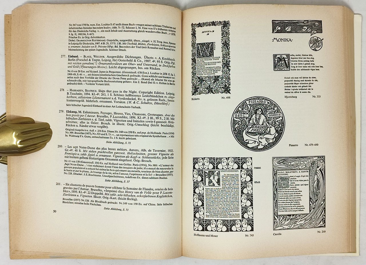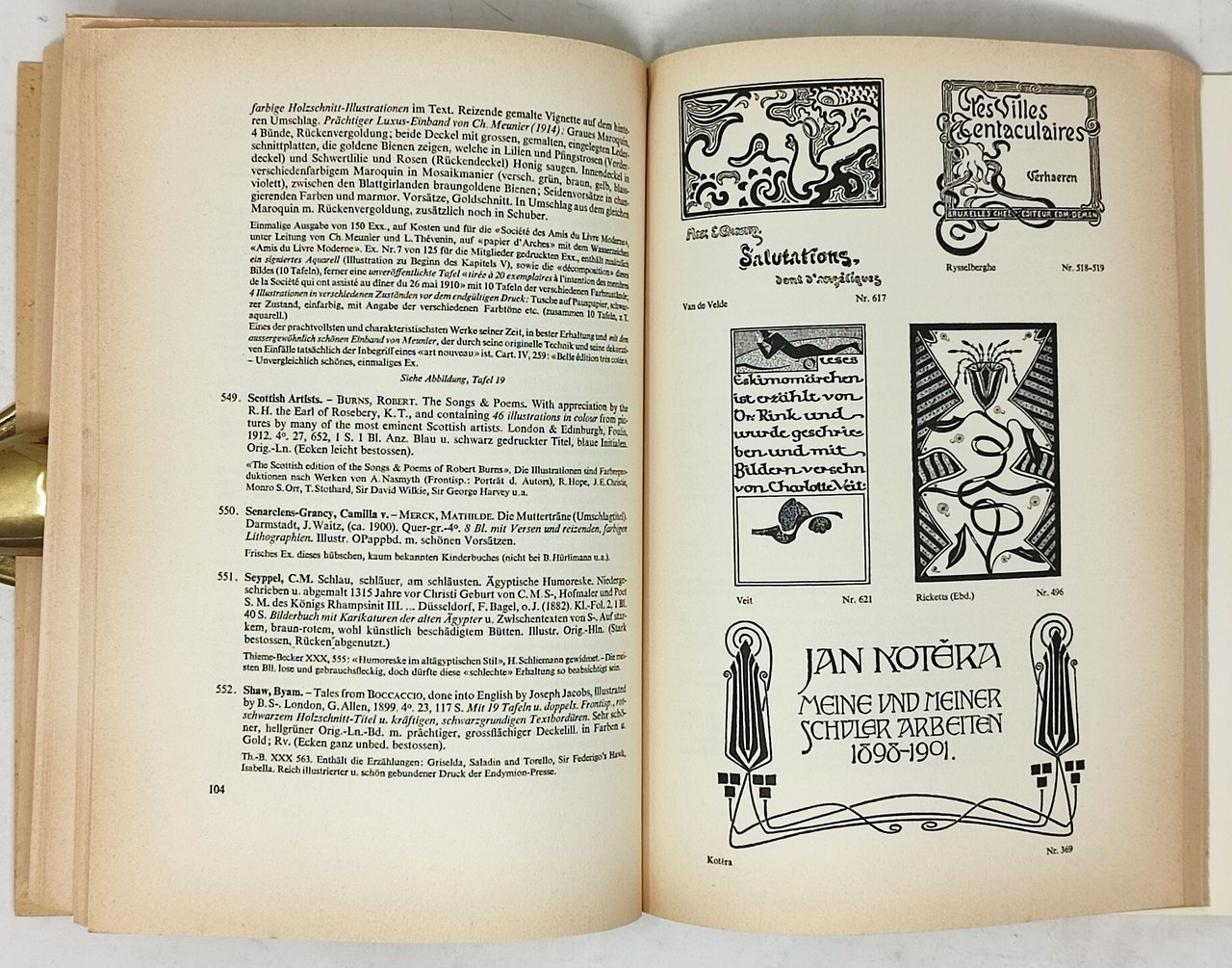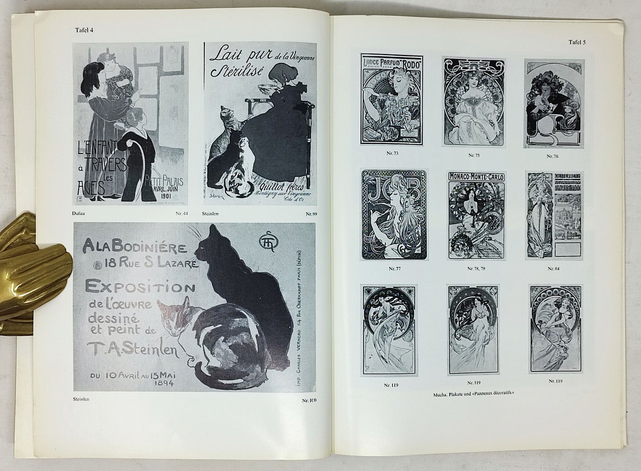Catalogo di vendita dell'asta (n. 124) tenuta in Svizzera, a Berna, il 22 e il 23 marzo del 1968. Formato: 19,5 x 27,5 cm circa. Testo in lingua tedesca. Con immagini in nero nel testo e 27 tavole illustrate in nero (su carta in finitura lucida) al fondo del volume. Numerosi lotti, riconducibili al Liberty e all'Art Nouveau, divisi in diverse categorie tra cui manifesti, disegni, libri illustrati e riviste. Stato di conservazione: qualche segno del tempo e dell'utilizzo sulla copertina che presenta piccoli taglietti in corrispondenza dei margini del dorso e minuscole macchioline marroni sul margine siperiore e su quello verticale del piatto anteriore. Interno in buono stato conservativo (si segnala esclusivamente una leggera e appena accennata ammaccatura dell'angolo superiore esterno del corpo del volume).Non sono presenti segni nel testo.
