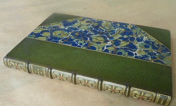 Un volume de format in 8° de 4 ff. (garde, faux-titre, justification, frontispice en double état); 170 pp.; 15 illustrations gravées en double état. Reliure de l'époque en demi maroquin à coins vert empire; dos richement orné à 5 nerfs; tête dorée. Couverture conservée. Reliure signée Champs. Couverture roussie, corps de l'ouvrage très frais. Tirage total à 225 exemplaires tous sur vélin du Marais; celui-ci N°43. 50 exemplaires sur papier japon, mais sans les illustrations, ont été tirés à part. Charmant exemplaire. Voir photos.