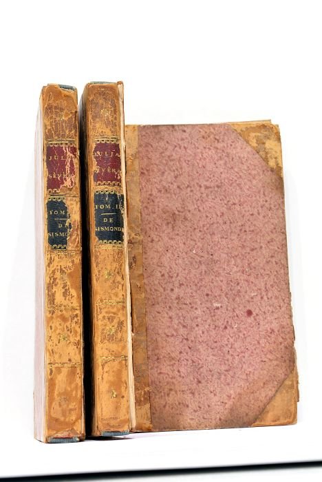 3 volumes in-12. VIII. 231pp. + 2ff. 228pp. 1f. + 2ff. 252pp. 1f. Demi-basane à coins, dos lisses ornés (Reliure de l'époque usagée: Plats supérieurs déreliés, petits manques de cuir au dos, plats et coiffes frottés). Rousseurs. Ouvrage sur le Moyen-Âge de l'économiste et historien, Simonde de Sismondi. Ex-libris héraldique de l'Écossais James Hill (1782-1867). Autre ex-libris de l'université de Keele.