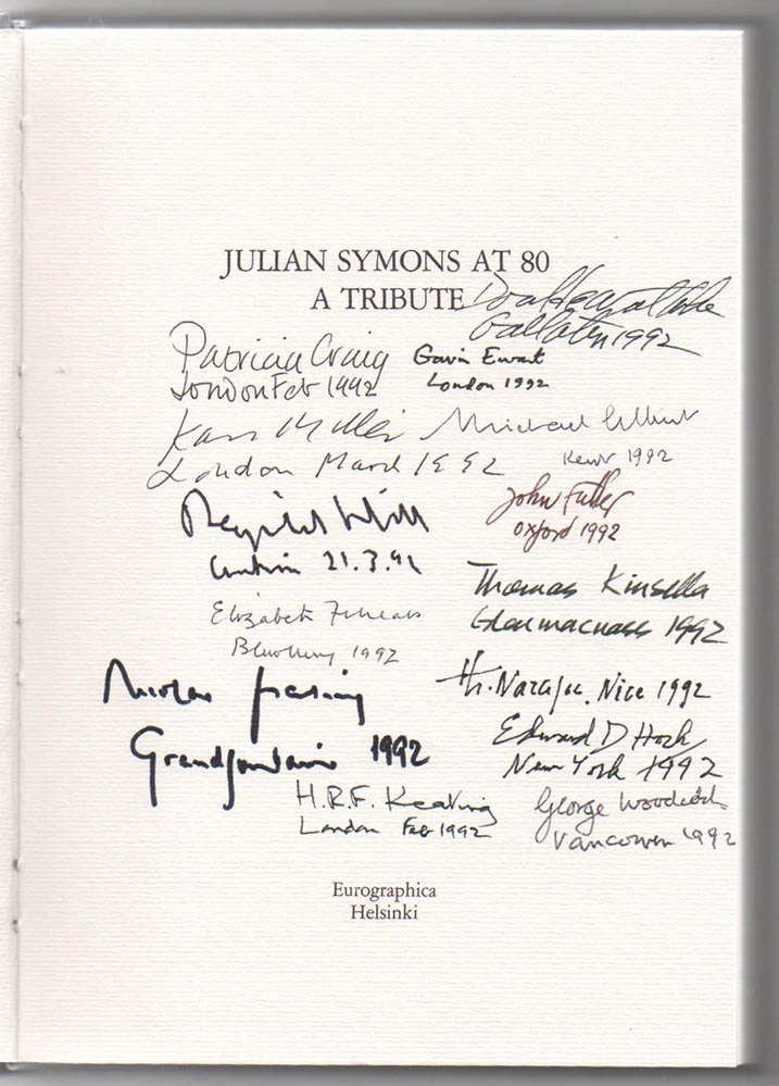 LIBROPrima edizione, tiratura di testa.CON AUTOGRAFO.Esemplare in stato di nuovo, il n. 2 nella tiratura di sole cento copie con le firme autografe degli autori.Della Festschrift per l’ottantesimo compleanno di Symons, a cura di Patricia Craig, oltre ai mille esemplari comuni, furono emesse 100 copie su carta Michelangelo delle Cartiere Magnani di Pescia, con l’incisione originale «Ritratto di Julian Symons» numerata e firmata dell’artista gallese Jeffrey Morgan e con le firme e le date autografe di tutti i partecipanti (eccetto Patricia Highsmith): Patricia Craig, Reginald Hill, Edward D. Hoch, Thomas Narcejac, Elizabeth Ferrars, Donald E. Westlake, Michael Gilbert, Thomas Kinsella, John Fuller, Gavin Ewart, Karl Miller, H.R.F. Keating, Nicolas Freeling, George Woodcock.