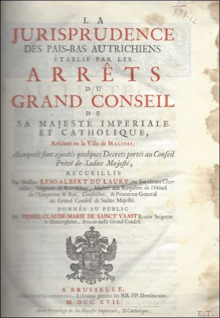 in-folio, [20] [ 459]-[29] pages., plein veau brun de l' poque, dos nerfs orn , pi ce de titre . dition originale de ce recueil de droit coutumier et de droit romain, avec commentaires, compos par le jurisconsulte gantois Du Laury (ca 1650-1716) et publi apr s sa mort par son disciple P.-C.-M. de Saint-Vaast. Le recueil de Du Laury n'est point une simple compilation rudite : on y voit le travail individuel d'un juriste exp riment , et ses arr ts sont souvent accompagn s de v ritables dissertations o le droit coutumier et le droit romain sont galement bien trait s (cf. Biogr. nat., VI, 269 ; Dekkers, 97).