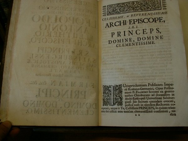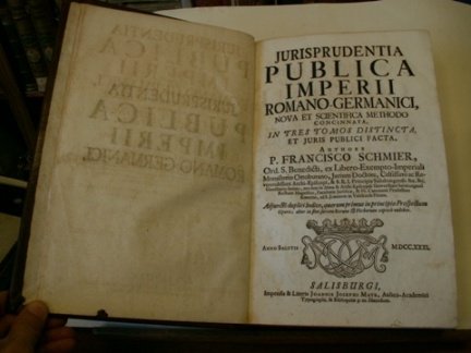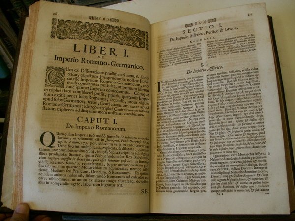 Volume in folio piccolo legato in pelle, dorso a nervi, sguardie, occhiello, frontespizio con bella marca tipografica, 14 carte, 504 pp., 7 carte d'indici (l'ultima coll'angolo inferiore restaurato, elisione di alcune sillabe su quattro righe d'indice al recto). Eccezionale saggi sulle istituzioni dell'Impero romano germanico, figlio del Sacro Romano Impero. Ad un preliminare sulla natura ed i principi fondanti della Giurisprudenza trattata, sui diversi ordimamenti degli Imperi succedutisi nella storia, dall'Assiro al Romano ed al Romano Germanico, si traccia un'accurata mappa delle qualit e dello stato delle Leggi giurisprudenziali prendendo a silloge i salienti delle figure quale l'Imperarore, le regole d'elezione, chi possa essere eletto, le potest che il titolo apporta, quali le qualit del Re dei Romani e dell'Augusta, quelle dei Vicari imperiali, le giurisprudenze territoriali dei vari Stati componenti l'Impero, gli Elettori e cos seguendo per ogni cosa sottoposta allo Jus Imperialis. Stampato su carta greve, forte e frusciante, qualche duerno con una lievissima brunitura, in eccellente conservazione, i soli difetti gi citati, opera egregia e preclara, d'assoluto interesse.