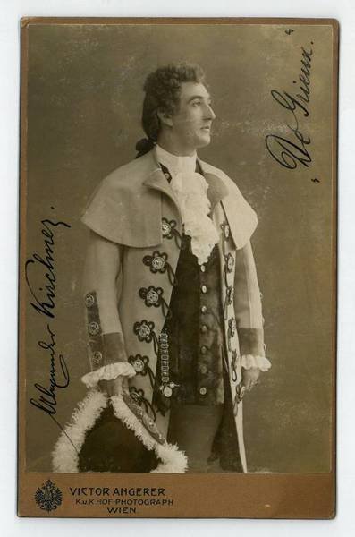 146:100 mm. Seinem lieben, teuren Herrn Dr. Winter mit der Bitte um freundliche Erinnerung [.]. - Kniestück im Profil im Rollenkostüm des des Grieux aus Massenets "Manon", als der Kirchner im Jahr zuvor an der Wiener Hofoper debütiert hatte. - Aus dem Atelier Victor Angerer, Wien, mit dessen gedr. Signet am Trägerkarton.