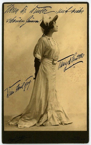 216 x 137 mm. Ganzfigürliche Darstellung der Schauspielerin im Profil aus dem Atelier Eugen Schöfer, Wien mit dessen gedr. Signet am unteren Rand des Trägerkartons. Gewidmet "Herrn Dr. Winter mit vielen schönen Grüßen" (d. i. der k. k. Hofsekretär der Generalintendanz der Hoftheater Dr. Ludwig Winter [urspr. Storozynetz, 1872-1922]).