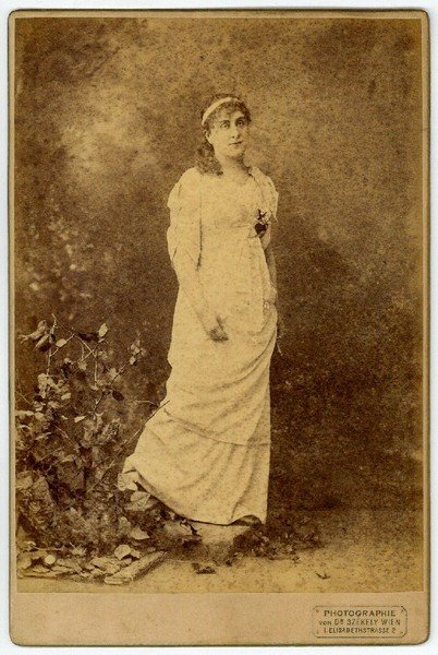 164:109 mm. Ganzfigürliche Darstellung der Schauspielerin im Rollenkostüm aus dem Atelier Dr. Székely, Wien. Verso-Seite mit eh. Widmung und U. an einen namentlich nicht genannten Adressaten: "Mein Herz, ich will dich fragen, was ist denn Liebe. Sag? Zwei Seelen und ein Gedanke, zwei Herzen und ein Schlag".