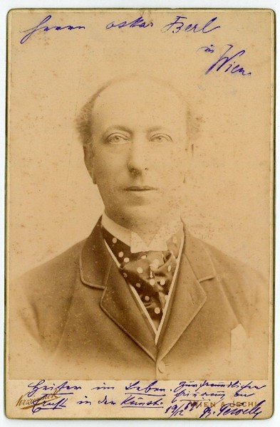 165:107 mm. Brustbild en face aus dem Atelier Krziwanek, Wien, mit dessen gedr. Signet am unteren Rand des Trägerkartons. Die Bildseite signiert und mit eh. Widmung an Oskar Berl: "Heiter im Leben. Ernst in der Kunst". - Leicht fleckig.
