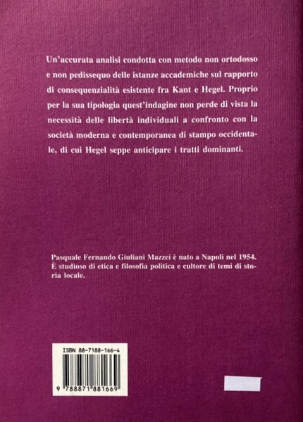 Lo storicismo hegeliano in rapporto all'illuminismo germanico di Kant, che ha avuto il merito di anticipare i temi classici del romanticismo filosofico e politico, tanto cari ai protagonisti della memorabile fase storica del Risorgimento europeo. L'analisi dell'autore intende costituire una introduzione ai due grandi pensatori tedeschi che a cavallo tra Sette e Ottocento posero le basi per una moderna interpretazione del mondo.