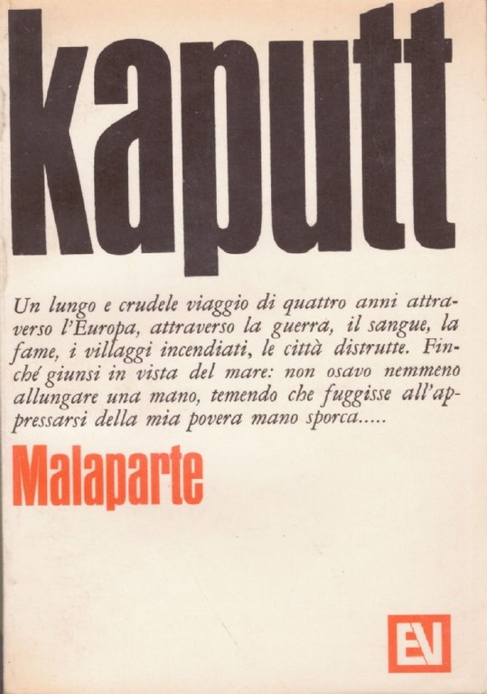 Brossura, formato cm. 18,5 x 12 e pagine 418. Kaputt è il resoconto dell’esperienza vissuta da Curzio Malaparte in qualità di corrispondente di guerra durante il periodo dal maggio 1941 all’agosto 1943. Un resoconto crudele, ferocemente grottesco e per questo ancora più dolente. Una narrazione tra la cronaca e il racconto visionario. Un ritmo incessante con una delineazione dei personaggi di grande capacità evocativa e simbolica. Buone/Ottime condizioni. V1018