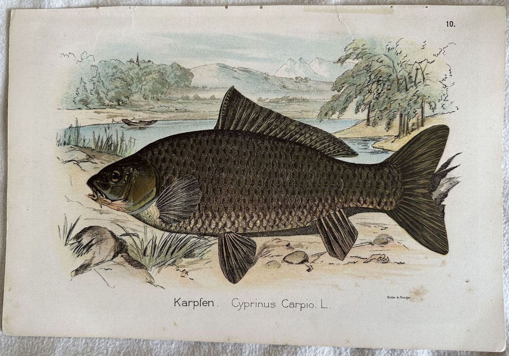 Cromolitografia di inziio novecento che rappresenta una carpa comune nel suo ambiente naturale.<BR>In buone condizioni, fioriture. AUTORE: Adolf Hofer (1869-1927)<BR>TECNICA: acquaforte DIMENSIONI FOGLIO: cm 17x25,5<BR>DIMENSIONI INCISIONE: cm 13x21<BR>EPOCA: inizio novecento. Chromolithography of early 20th century, a common carp in its natural environment In good conditions, foxing. AUTHOR: Adolf Hofer (1869-1927) Date: early 20th century Technique: etching Size of the page:cm 17x25,5 Size of the engraving: cm 13x21 Conditions: Good conditions. Some foxing