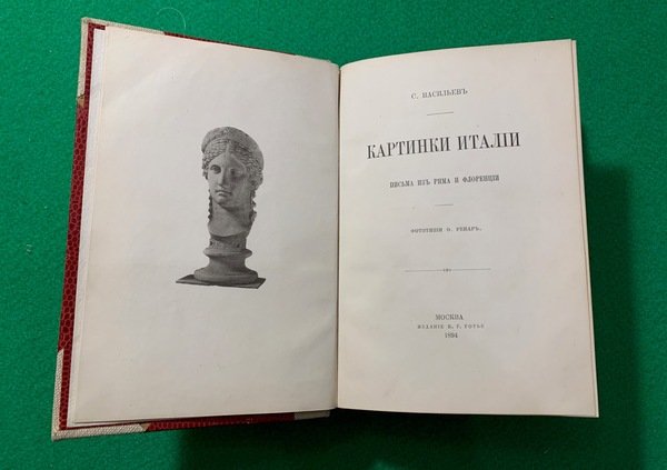 In 8°; (8 compresa antiporta illustrata), 329, (9) pp. e 19 c. di tav. fuori testo con scorci di monumenti e vedute, ognuna protetta da velina. Legatura realizzata intorno al 1950 in mezza-tela con piatti foderati con carta rossa. L'opera venne tirata in soli 600 esemplari. Prima, assai rara edizione, di questo viaggio descrittivo fra le bellezze artistiche di Roma e Firenze, scritto dal celebre storico del teatro, critico e giornalista russo che scrisse sotto lo pseudonimo di S. Vasiliev. Dal 1875 Flerov collaborò stabilmente al "Russian Bulletin" e al "Moskovskiye Vedomosti", dove pubblicò feuilletons teatrali, rassegne musicali e reportage su mostre d'arte, firmandoli con lo pseudonimo di S. Vasiliev. Ha collaborato con "Russian Word" e "Russian Review", dove sono stati pubblicati numerosi suoi articoli sul teatro. Il libro "Pictures of Italy" contiene lettere e appunti dal viaggio in Italia di Sergei Flerov: la diversità della vita culturale delle città europee, recensioni di eventi di alto profilo nella vita teatrale, concerti d'opera. In particolare, Vasiliev ha ascoltato l'esecuzione delle opere di Ciajkovskij sui palcoscenici europei, ha letto le traduzioni delle opere di grandi scrittori russi nella stampa locale e ha visitato una mostra di dipinti di artisti suoi compatrioti come Vereshchagin. Per descrivere ad esempio Firenze, Flerov narra: "Non crediate che l'epiteto città dei fiori rimandi a qualcosa di allegorico. Firenze è letteralmente inondata di fiori. Si vendono ovunque, a ogni piè sospinto, a ogni angolo, a ogni portone. La mattina non appena apro la finestra, ecco che scorgo dei fiori. Sulle enormi panche di marmo che costeggiano il Palazzo Strozzi (si trova proprio di fronte alle mie finestre) fanno bella mostra migliaia di fiori; intorno ad essi si accalca la folla, a mezzogiorno non è rimasto neanche un mazzolino ( ) Si scrive e si legge, si fa colazione e si pranza sempre in mezzo ai fiori ( )" (Vasil'ev 1894: 324). Prima assai rara edizione, completa di tutte e 20 le tavole (una delle quali all'antiporta).