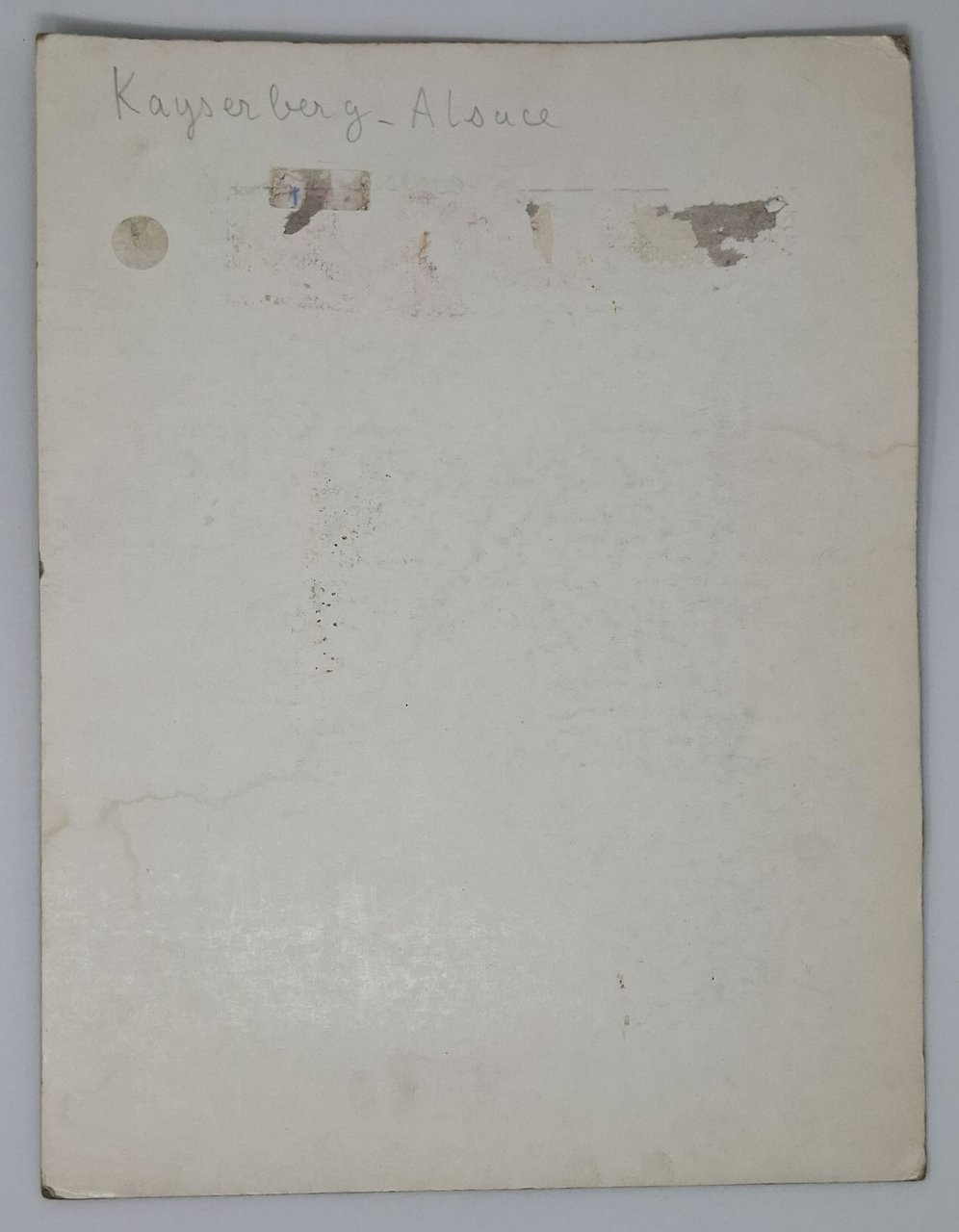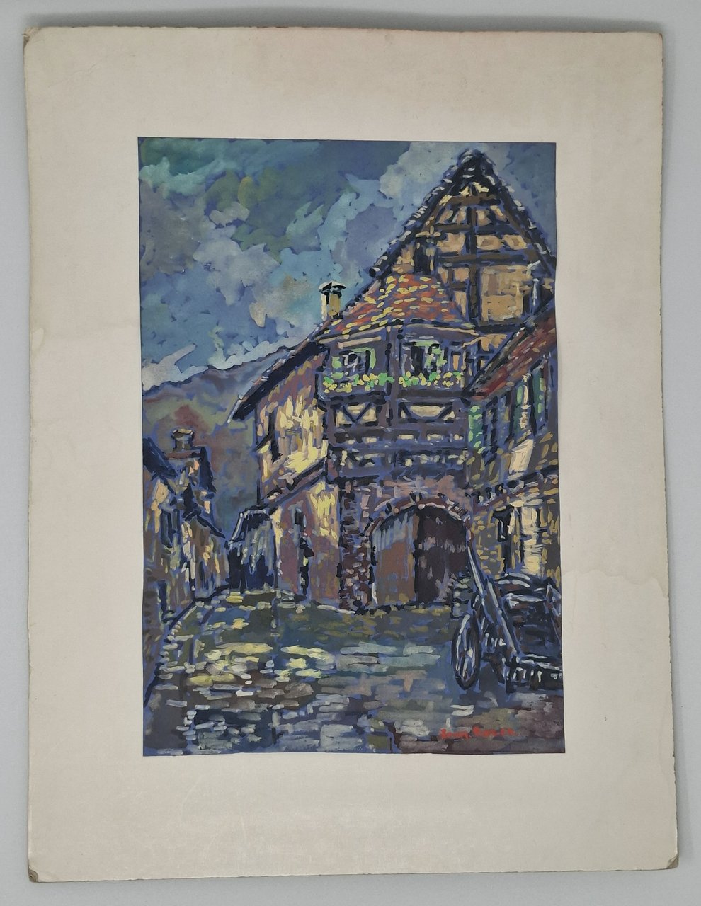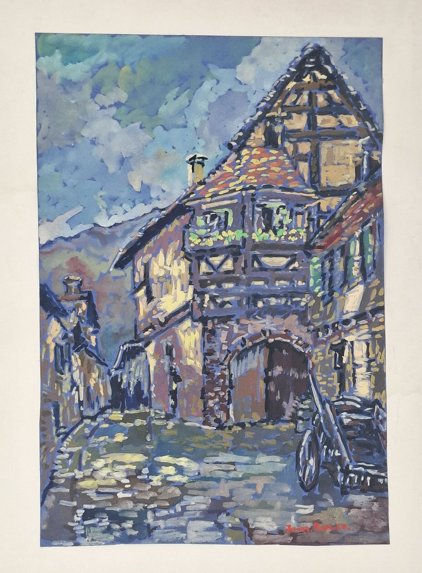 Dipinto, applicato su cartoncino, realizzato con tecnica mista, firmato in rosso, in basso a destra 'Jean - Roger' e titolato, a matita sul retro del supporto, 'Kayserber - Alsace'. Jean Roger è stato un artista francese, nato nel 1924 e morto nel 2015. Le sue opere sono state più volte vendute in asta. Dimensioni del dipinto: 17 x 25 cm circa. Dimensioni del cartoncino utilizzato come supporto: 26 x 34 cm circa. Stato di conservazione: dipinto decisamente ben conservato. Qualche piega e segno d'uso sul cartoncino (abrasioni sul retro). Paesaggio realizzato con la tecnica molto personale di Roger.