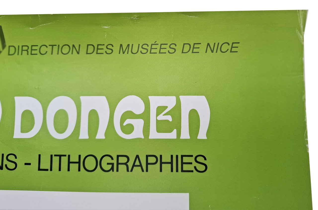 Manifesto originale, pubblicizzante la mostra 'Aquarelles - Dessins - Lithographies' di Kees Van Dongen tenutasi nell'estate 1981 presso il Museo di Belle Arti 'Jules Cheret' di Nizza (Francia). Imprimerie Jober, Nice. leggere stropicciature marginali, una minuscola ammaccatura nella parte inferiore del manifesto (alla sinistra della scritta 'été') ma, nel complesso, un buon esemplare. Dimensioni: 44 x 64 cm circa. Il manifesto è stato conservato arrotolato su se stesso e come tale verrà inviato inseritoin un tubo di cartone rigido.