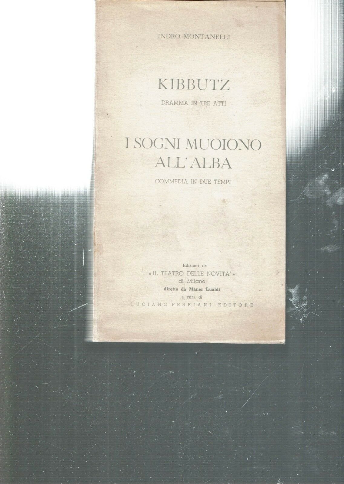 KIBBUTZ. DRAMMA IN TRE ATTI /I SOGNI MUOIONO ALL'ALBA. COMMEDIA IN DUE TEMPI ** MONTANELLI INDRO ** EDIZIONI DE IL TEATRO DELLE NOVITA MILANO 1962. CM 21 X 12. PP. 233 + (3). IN BROSSURA EDITORIALE. LIBRO DA COLLEZIONE. BUONISSIME CONDIZIONI RIF. LIBR. LIBRI RARI �