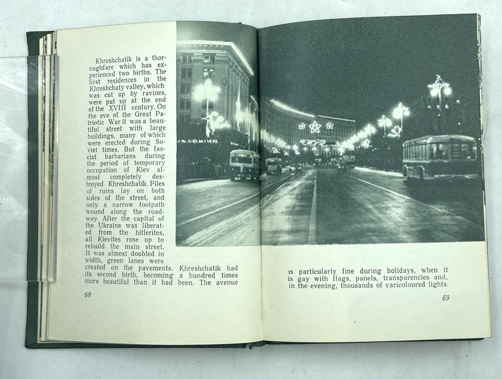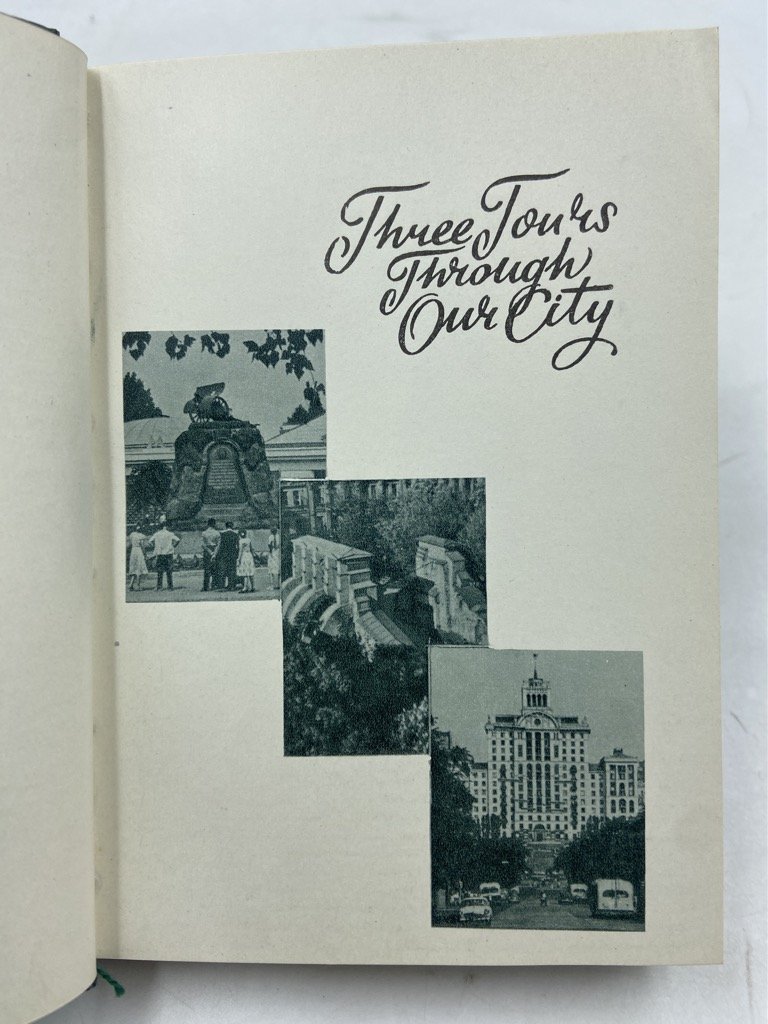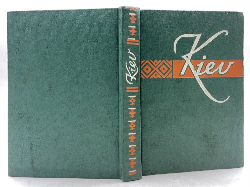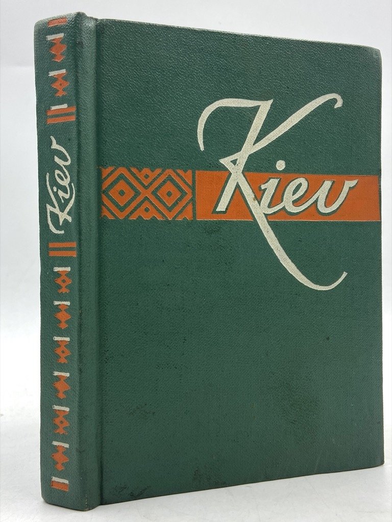 Tela editoriale (non presente sovraccoperta), cm 14.5 x 10.5, pp 187 (5), con numerose fotografie in viraggio verde. Testo in inglese. Guida di Kiev per il pubblico occidentale, composta dal letterato e giornalista ucraino Leonid Dayen (1929-2017) con Pavel Poznyak e Mark Cherp negli anni ‘50, e tradotta in inglese da A. S. Mistetsky. La guida si apre con alcune pagine introduttive intercalate da alcune grafiche che esaltano i risultati dell’organizzazione sovietica della città: sviluppo demografico ed edilizio, produzione industriale, servizi e università, numero di apparecchi televisivi e radiofonici ecc. La guida si sviluppa in tre itinerari: The Stormy Days of Revolution, che illustra monumenti e luoghi del periodo della rivoluzione; Mother of Russian Cities, alla scoperta di antiche chiese e testimonianze della Rus’ di Kiev; The Capital of Flourishing Ukraine, che esalta lo sviluppo sovietico della città, i servizi, gli edifici pubblici, i parchi, gli svaghi e gli sport, i trasporti ecc. In fine, una lista di alberghi, ristoranti, biblioteche e servizi.
