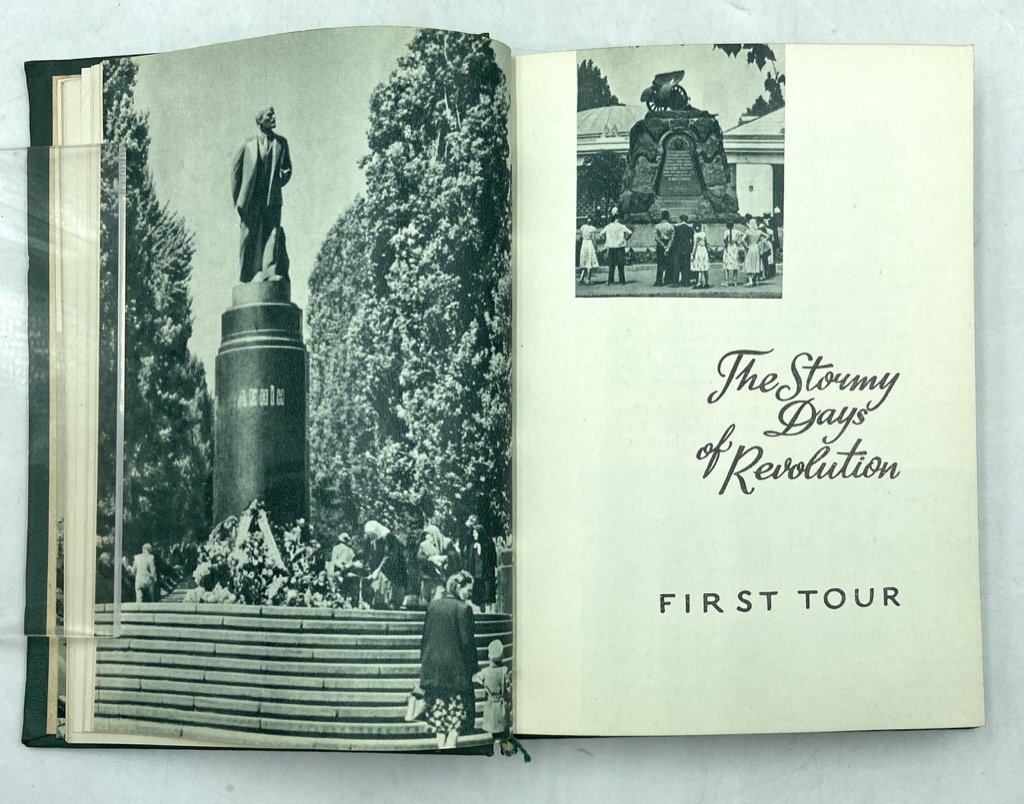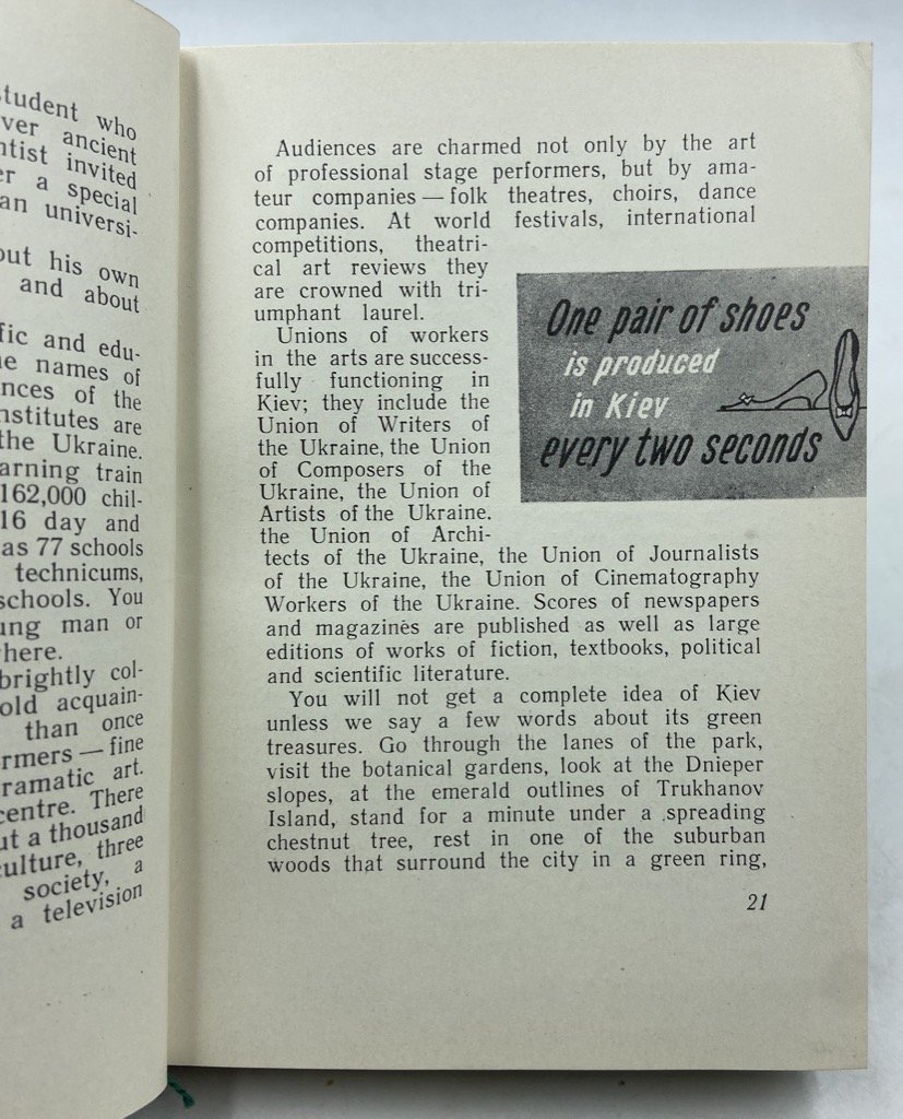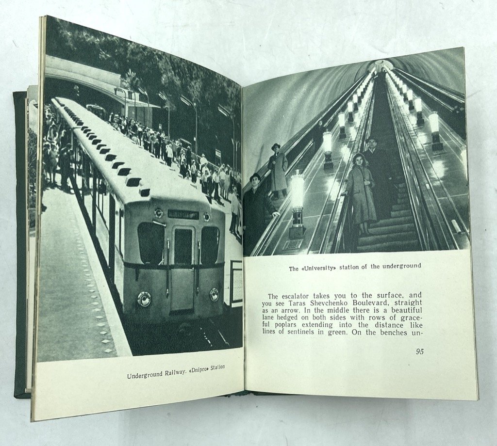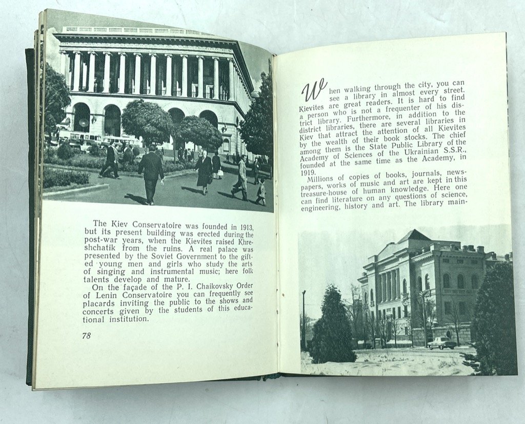 Tela editoriale (non presente sovraccoperta), cm 14.5 x 10.5, pp 187 (5), con numerose fotografie in viraggio verde. Testo in inglese. Guida di Kiev per il pubblico occidentale, composta dal letterato e giornalista ucraino Leonid Dayen (1929-2017) con Pavel Poznyak e Mark Cherp negli anni ‘50, e tradotta in inglese da A. S. Mistetsky. La guida si apre con alcune pagine introduttive intercalate da alcune grafiche che esaltano i risultati dell’organizzazione sovietica della città: sviluppo demografico ed edilizio, produzione industriale, servizi e università, numero di apparecchi televisivi e radiofonici ecc. La guida si sviluppa in tre itinerari: The Stormy Days of Revolution, che illustra monumenti e luoghi del periodo della rivoluzione; Mother of Russian Cities, alla scoperta di antiche chiese e testimonianze della Rus’ di Kiev; The Capital of Flourishing Ukraine, che esalta lo sviluppo sovietico della città, i servizi, gli edifici pubblici, i parchi, gli svaghi e gli sport, i trasporti ecc. In fine, una lista di alberghi, ristoranti, biblioteche e servizi.