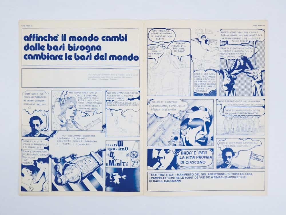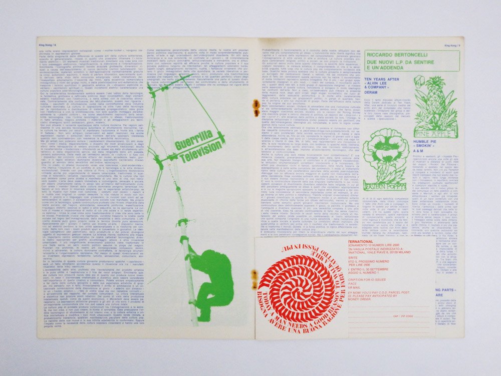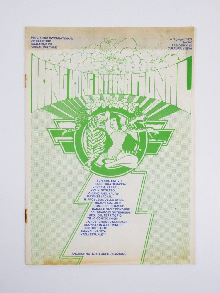 PERIODICOCollezione completa.Tutto il pubblicato (numeri 1 e 2 del gennaio e giugno 1972) in ottime condizioni (leggera fioritura al piatto anteriore del primo numero e tracce di ruggine in corrispondenza dei punti metallici, per il resto esemplari privi di particolari difetti da segnalare). Fondata a Milano nel 1972 e attiva per soli due numeri usciti nel gennaio e giugno dello stesso anno, «King Kong International. Periodico di cultura visiva» fu una rivista alternativa dedicata all’arte diretta da un comitato di redazione composto da Rara Bloom, Dante Goffetti, Bruno Sanguanini, Riccardo Sgarbi e Mizio Turchet. Accompagnati da illustrazioni e fotografie virate blu (nel primo numero) e verde (nel secondo), i testi raccolti nei due fascicoli spaziavano da contributi originali a interviste a personaggi del mondo artistico e musicale (da segnalare l’intervista a John Cage presente nel numero di gennaio) a traduzioni di scritti apparsi altrove (come un articolo di Jacques Lacan originariamente pubblicato sulla rivista surrealista «Le Minotaure» nel 1933). Ovviamente attento alla scena internazionale, il periodico riportava — a partire dal sottotitolo «An Electric Magazine of Visual Culture» — occasionali traduzioni in lingua inglese. Molto rara la collezione completa dei due fascicoli.