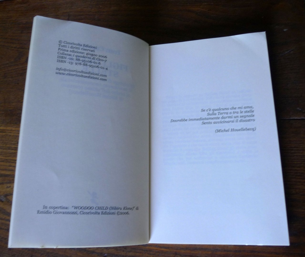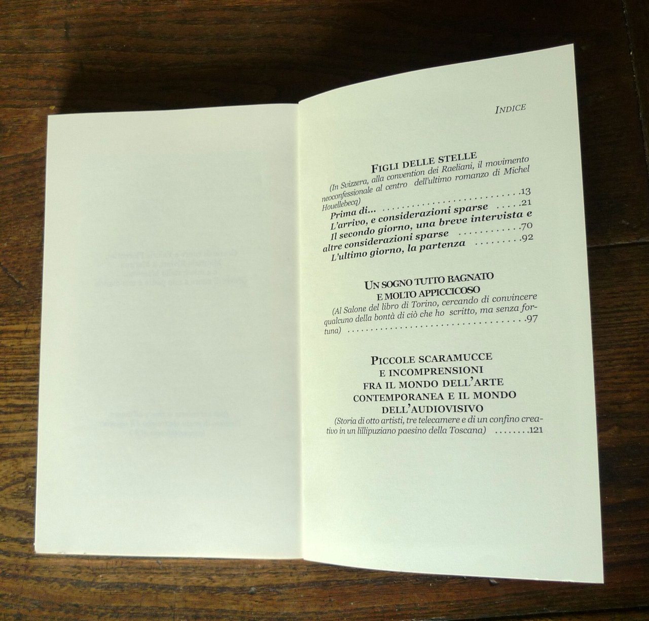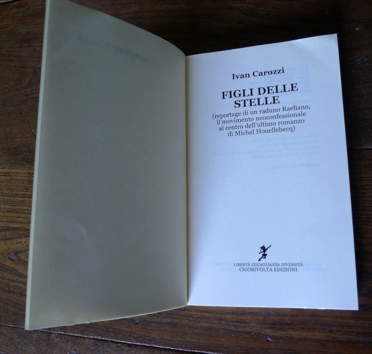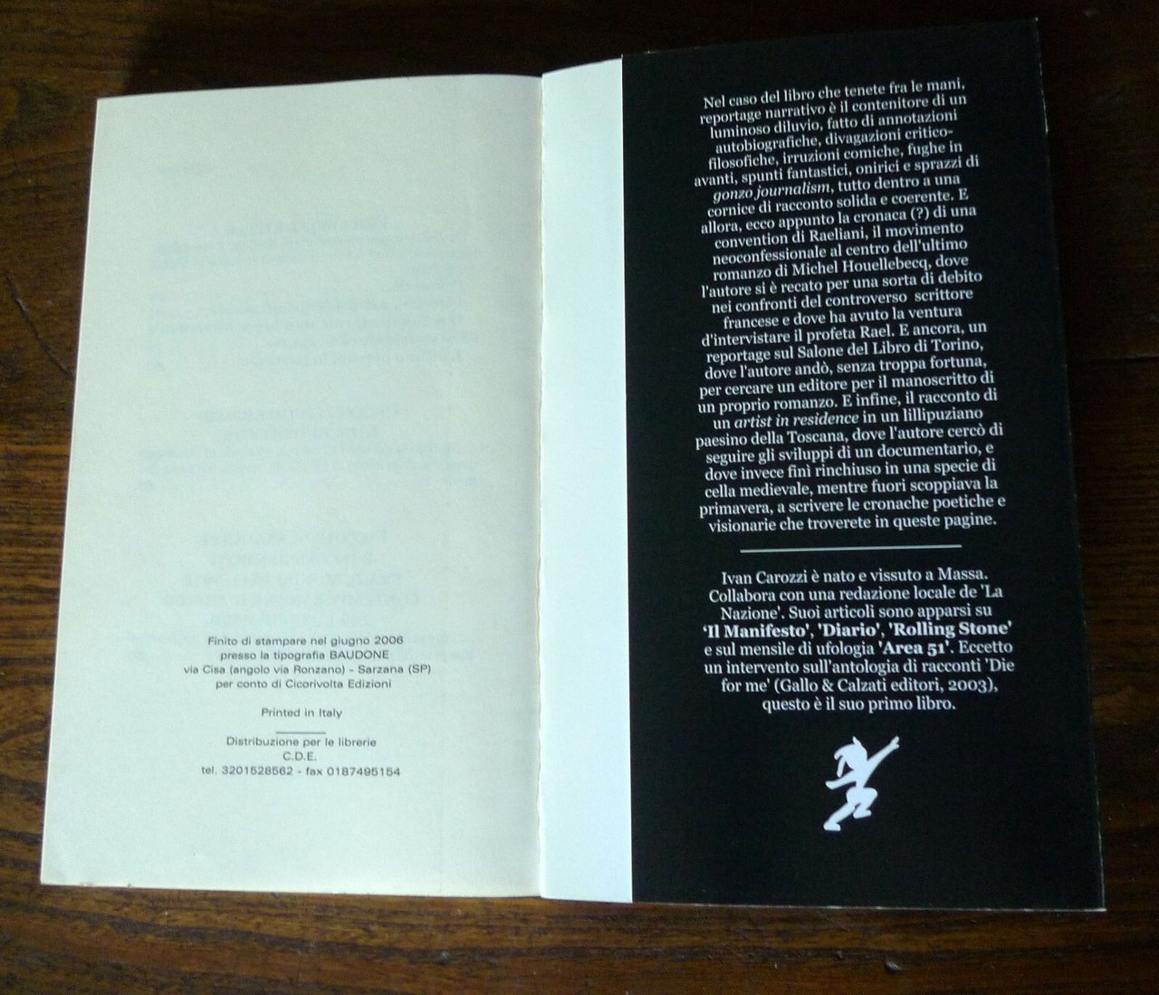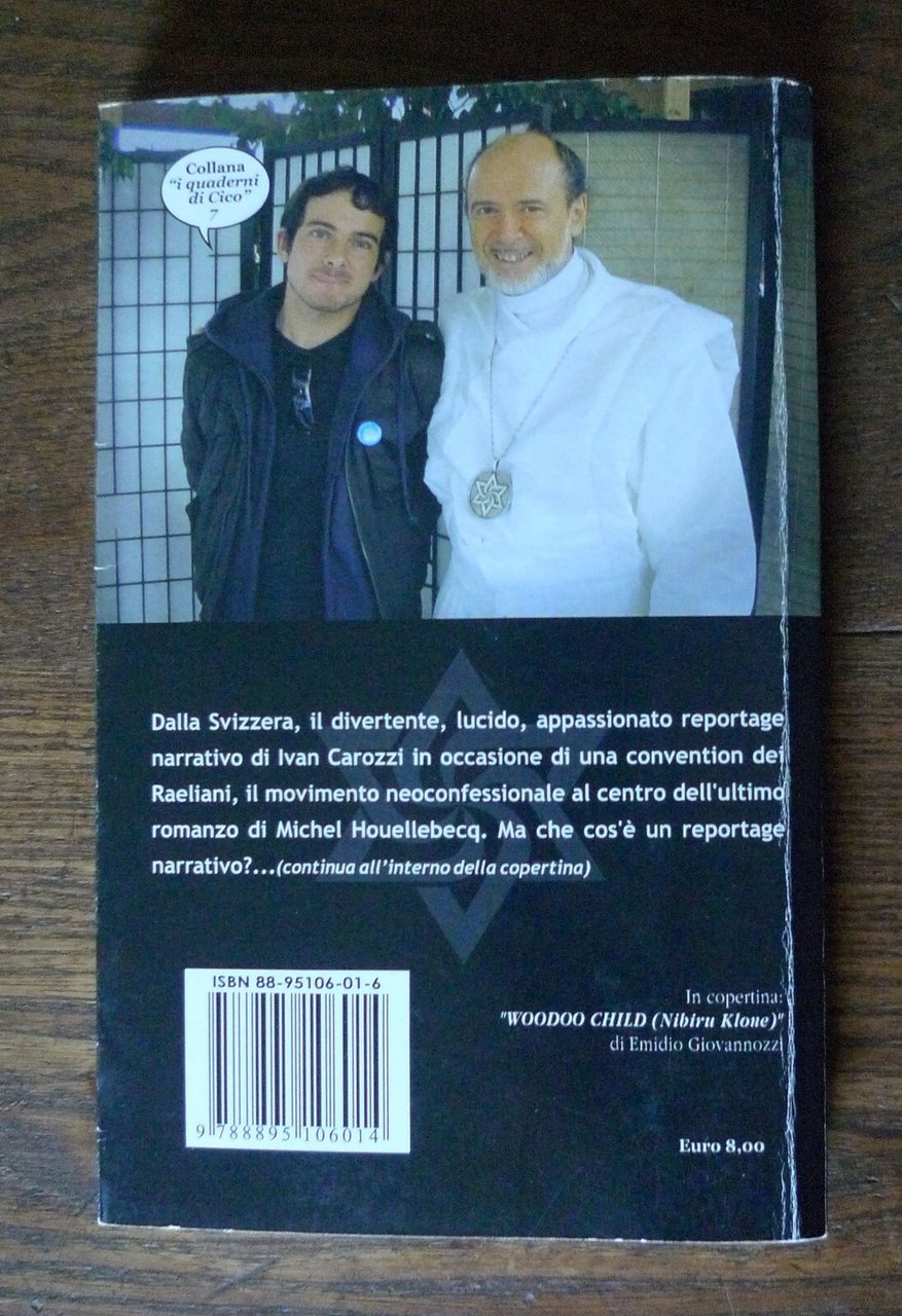 Ivan Carozzi,FIGLI DELLE STELLE(reportage di un raduno Raeliano, il movimentoneoconfessionale al centro dell'ultimo romanzodi Michel Houellebecq).Cicorivolta Edizioni, Sarzana (SP) 2006,prima edizione: giugno 2006,brossura, 20,5x13 cm., pp.151,I QUADERNI DI CICO / 7,ISBN: 88-95106-01-6,peso: g.350cod.9492CONDIZIONI DEL LIBRO: ottime,pieghe in copertinadalle note editoriali:... Ma che cos'è un reportage narrativo? Nel caso di questo libro, è il contenitore di un luminoso diluvio, fatto di annotazioni autobiografiche, divagazioni critico-filosofiche, irruzioni comiche, fughe in avanti, spunti fantastici, onirici e sprazzi di gonzo journalism, tutto dentro a una cornice di racconto solida e coerente. E allora, ecco la cronaca (?) di una convention di Raeliani, il movimento neoconfessionale al centro dell'ultimo romanzo di Michel Houellebecq, dove l'autore si è recato per una sorta di debito nei confronti del controverso scrittore francese e dove ha avuto la ventura d'intervistare il profeta Rael. E ancora, un reportage sul Salone del Libro di Torino, dove l'autore andò, senza troppa fortuna, per cercare un editore per il manoscritto di un proprio romanzo. E infine, il racconto di un artist in residence in un lillipuziano paesino della Toscana, dove l'autore cercò di seguire gli sviluppi di un documentario, e dove invece finì rinchiuso in una specie di cella medievale, mentre fuori scoppiava la primavera, a scrivere le cronache poetiche e visionarie che troverete in queste pagine.