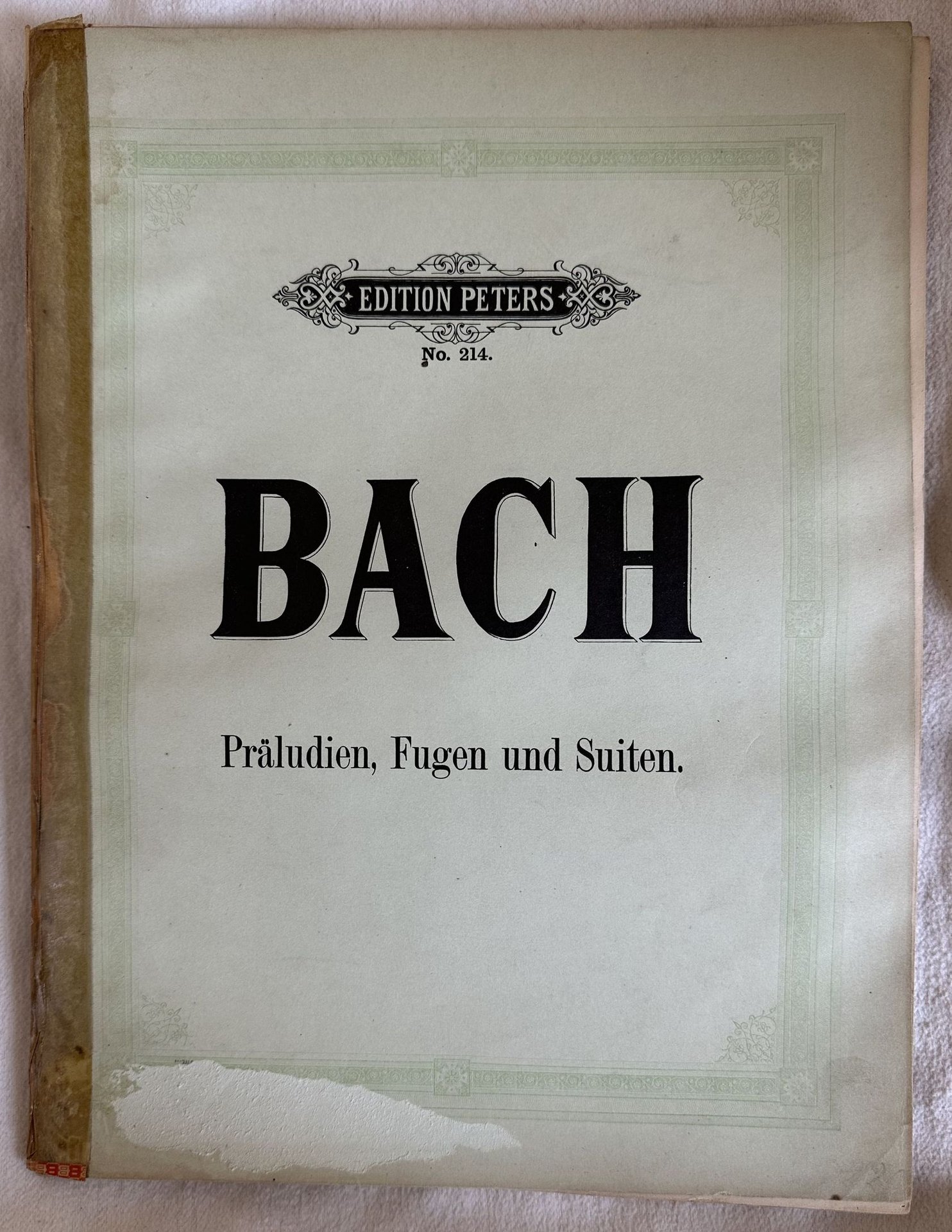 Edizione Peters di inizio novecento di alcune melodie di di Johann Sebastian Bach: Preludio con fuga; Fuga; Suite, Preludio con Fughetta; Preludio; Variante zu no. 2, Variante zu no. 3. In buone condizioni. Copertina editoriale in discrete condizioni con lievi usure marginali. Piatti staccati riparati con nastro adesivo. Legatura in mediocri condizioni con rotture e qualche pagina staccata. Pagine in discrete condizioni con rare fioriture. Lievi gore d'umidità. In 4. cm.31x23,5. Pp. 60.Peters edition of early 20th century of some melodies by Johann Sebastian Bach: Preludio con fuga; Fuga; Suite, Preludio con Fughetta; Preludio; Variante zu no. 2, Variante zu no. 3 In good conditions. Editorial cover in fair conditions lightly worn in the extremities. Plates are detached and repaired with adhesive tape. Binding in poor conditions with cracks and some page detached. Pages in fair conditions with occasional foxing. Light dump stains in the edges. In 4. cm.31x23,5. Pp. 60.