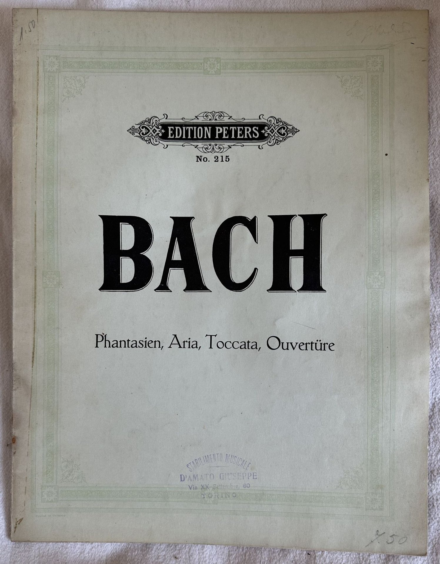 Edizione Peters di inizio novecento di alcune melodie di di Johann Sebastian Bach: Fantasia, Aria variata, Toccata, Ouverture, Fantasia. In buone condizioni Copertina editoriale in discrete condizioni con lievi usure marginali. Legatura in discrete condizioni con lievi rotture. Pagine in discrete condizioni con rare fioriture. Lievi gore d'umidità. In 4. cm.30,5x23,5. Pp. 35.Peters edition of early 20th century of some melodies by Johann Sebastian Bach: Fantasia, Aria variata, Toccata, Ouverture, Fantasia. In good conditions. Editorial cover in fair conditions lightly worn in the extremities. Binding in fair conditions with light cracks. Pages in fair conditions with occasional foxing. Light dump stains in the edges. In 4. cm.30,5x23,5. Pp. 35.