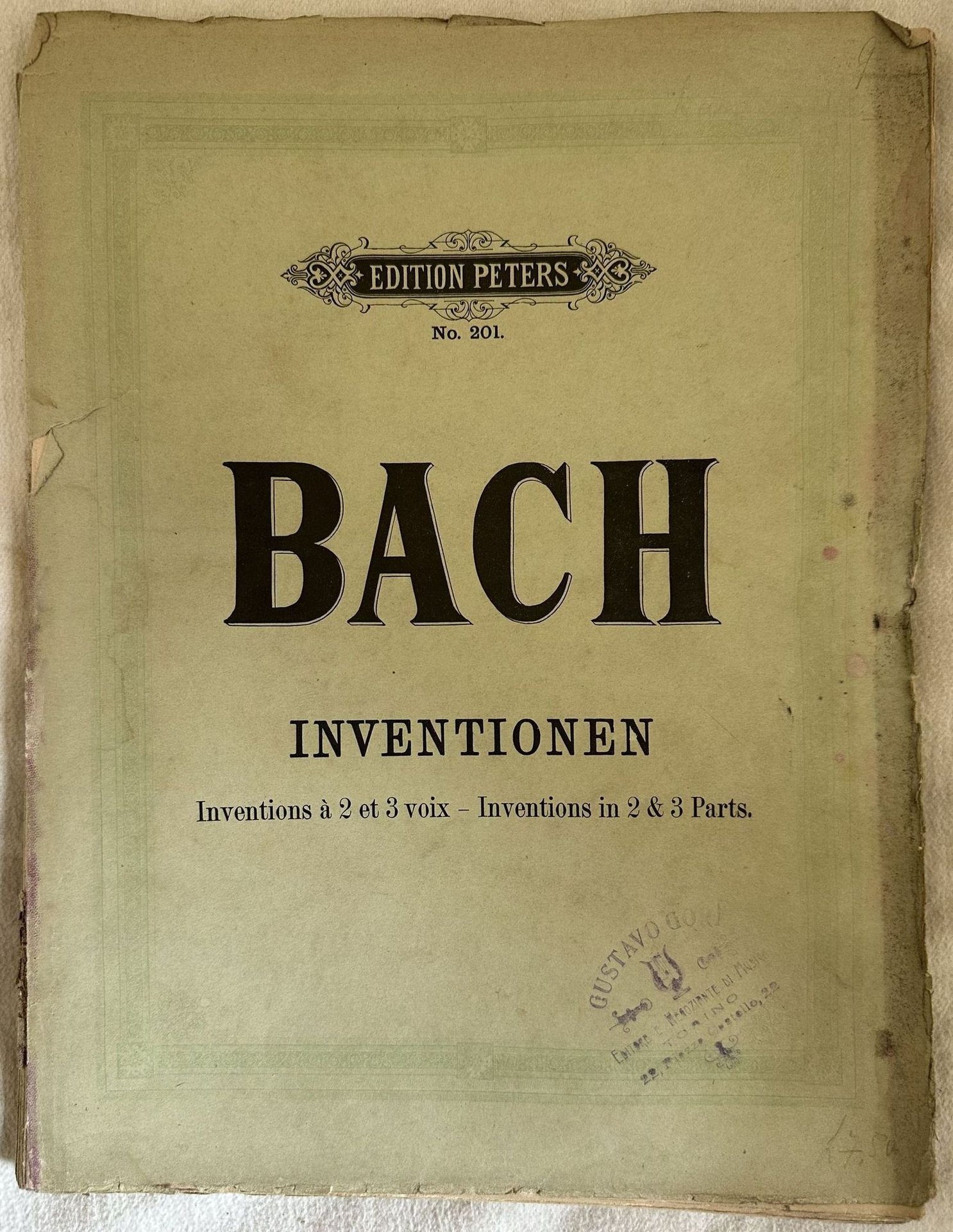 Edizione Peters di inizio novecento di alcune melodie: "15 Inventions à 2 voix", "15 Inventions à 3 voix" di Johann Sebastian Bach. In discrete condizioni.Copertina editoriale in discrete condizioni con lievi usure marginali. Piatti staccati. Legatura in mediocri condizioni con rotture. Pagine in discrete condizioni con rare fioriture. Lievi gore d'umidità. In 4. cm.31x24. Pp. 63.Peters edition of early 20th century of some melodies "15 Inventions à 2 voix", "15 Inventions à 3 voix" by Johann Sebastian Bach. In fair conditions. Editorial cover in fair conditions lightly worn in the extremities. Plates are detached. Binding in poor conditions with cracks. Pages in fair conditions with occasional foxing. Light dump stains in the edges. In 4. cm.31x24. Pp. 63.