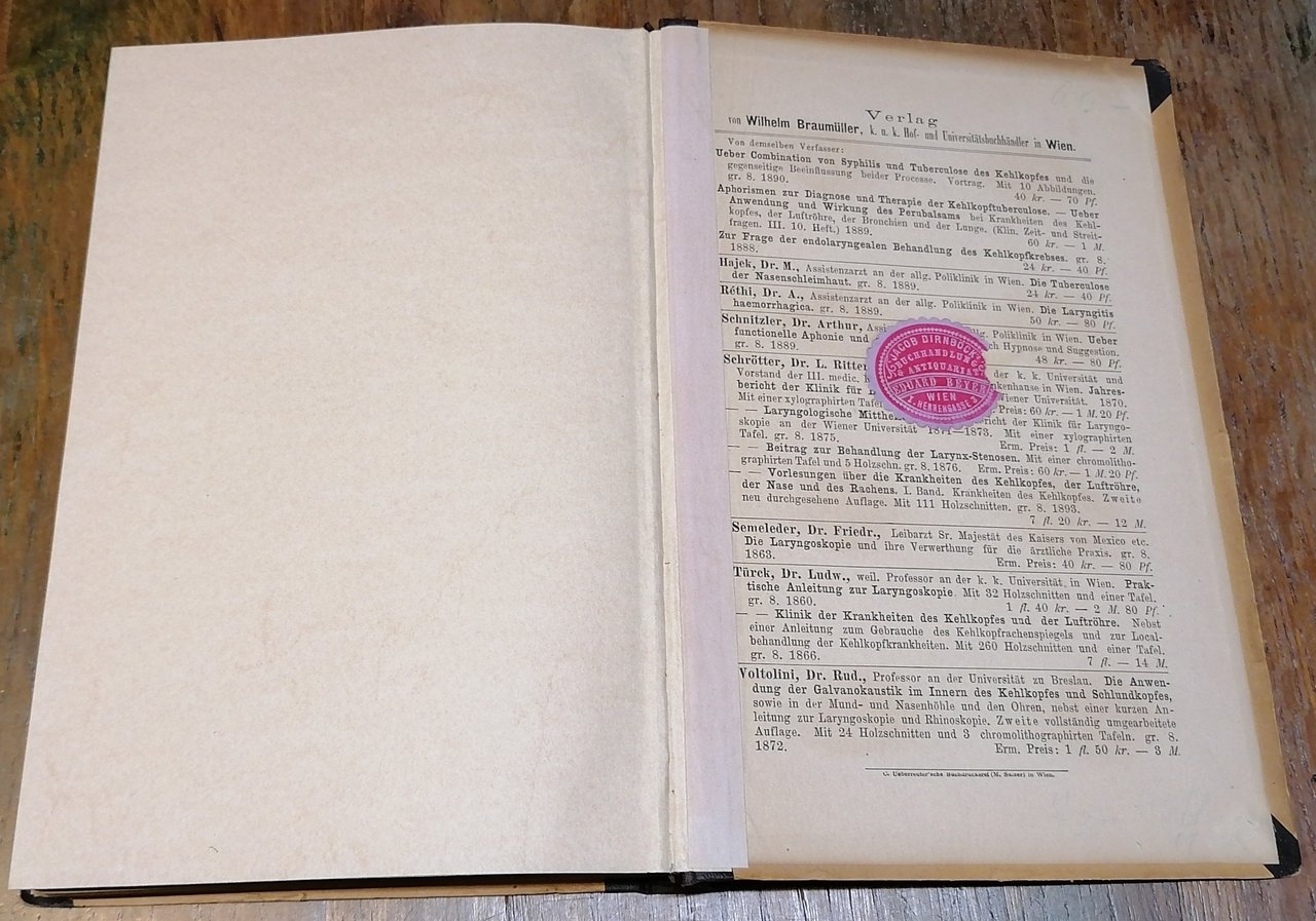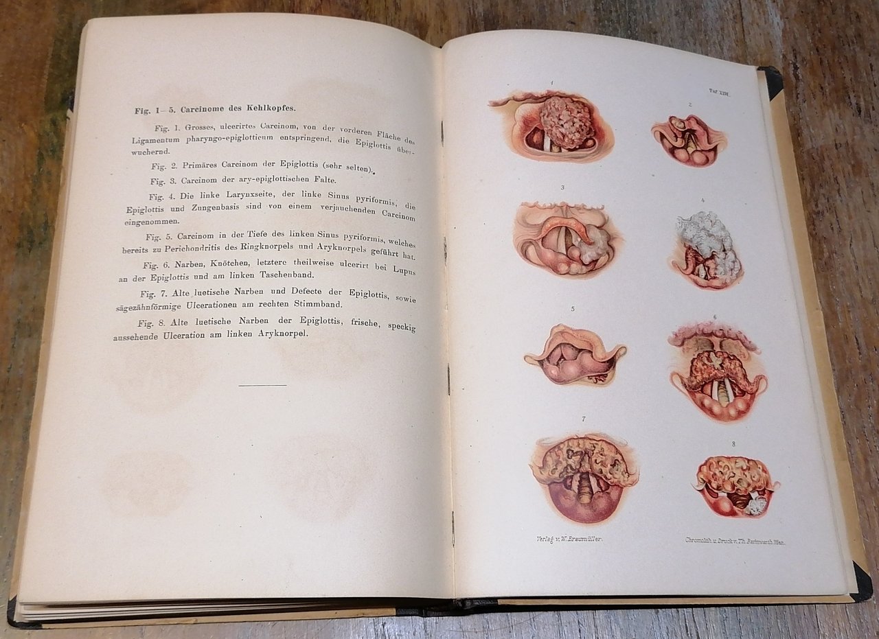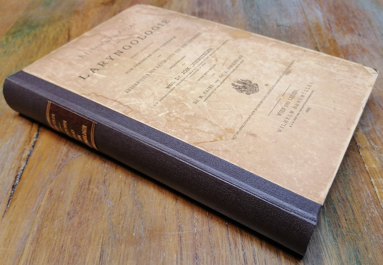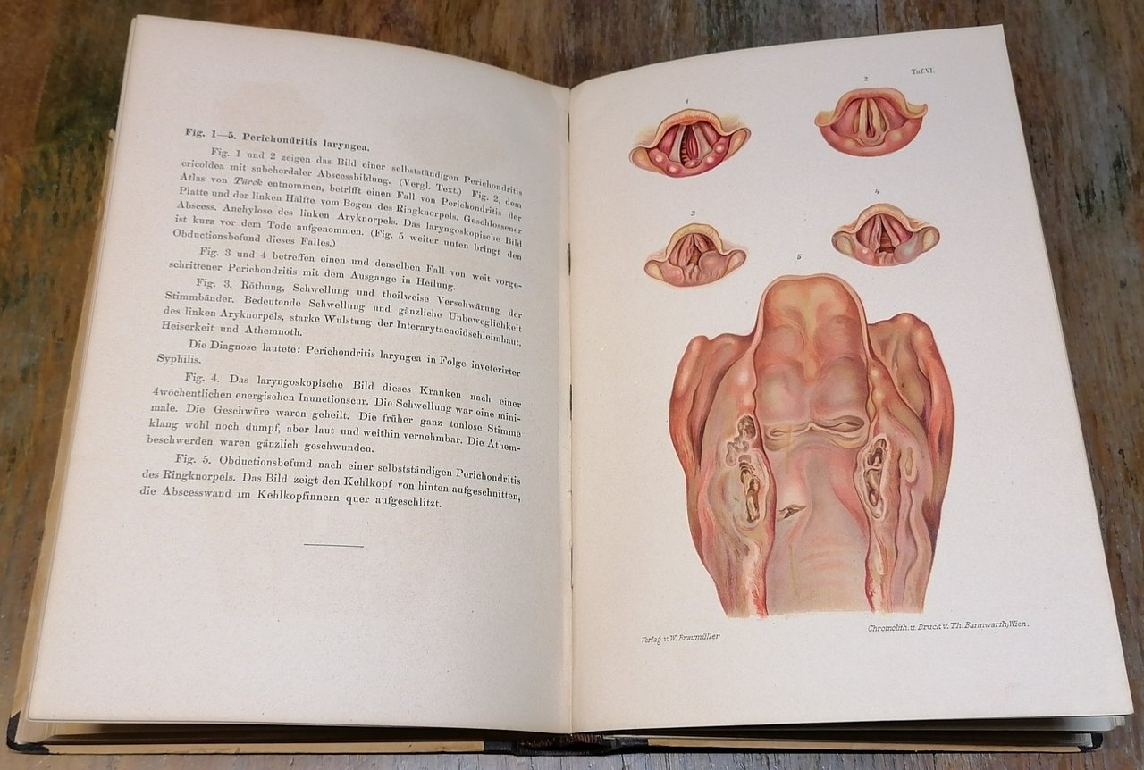 (Atlante clinico di Laringologia; Otorinolaringoiatria) In 8° (cm 24 x 16,5), legatura in mezza tela marrone scuro, al dorso tassello in pelle con titoli in oro, piatti in cartone editoriale a stampa con un'elenco di pubblicazioni della casa editrice ed un'etichetta di vecchia libreria viennese applicati al risguardo posteriore pp. VIII,254, con 56 disegni nel testo, 28 tavole fuori testo in cromolitografia su carta pesante con 186 figure e 62 pagine non numerate con didascalie e note. Legatura solida con dorso rifatto e lievi aloni al piatto anteriore, all'interno ottimo stato di conservazione di pagine di testo e tavole.