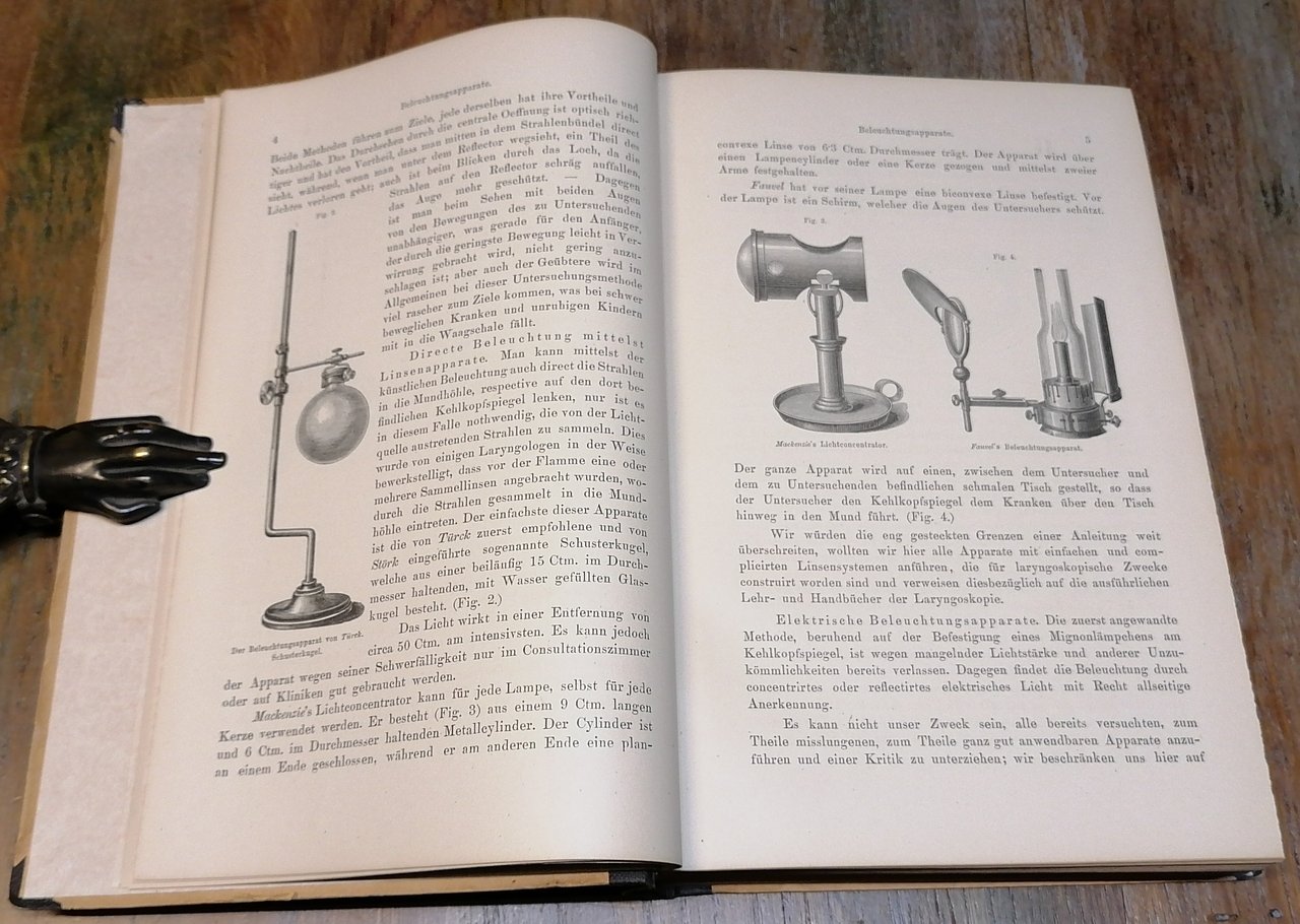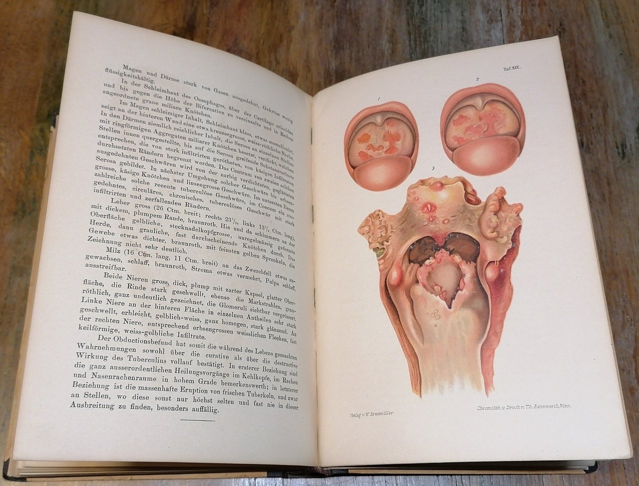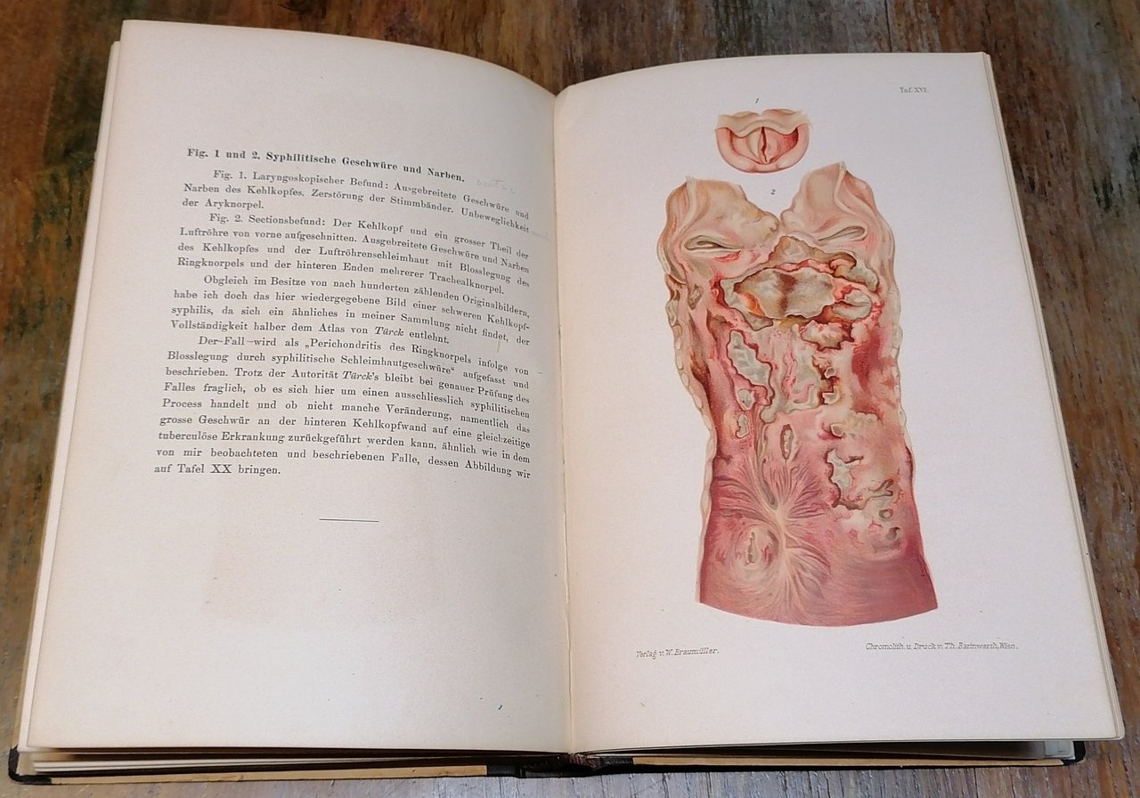 (Atlante clinico di Laringologia; Otorinolaringoiatria) In 8° (cm 24 x 16,5), legatura in mezza tela marrone scuro, al dorso tassello in pelle con titoli in oro, piatti in cartone editoriale a stampa con un'elenco di pubblicazioni della casa editrice ed un'etichetta di vecchia libreria viennese applicati al risguardo posteriore pp. VIII,254, con 56 disegni nel testo, 28 tavole fuori testo in cromolitografia su carta pesante con 186 figure e 62 pagine non numerate con didascalie e note. Legatura solida con dorso rifatto e lievi aloni al piatto anteriore, all'interno ottimo stato di conservazione di pagine di testo e tavole.