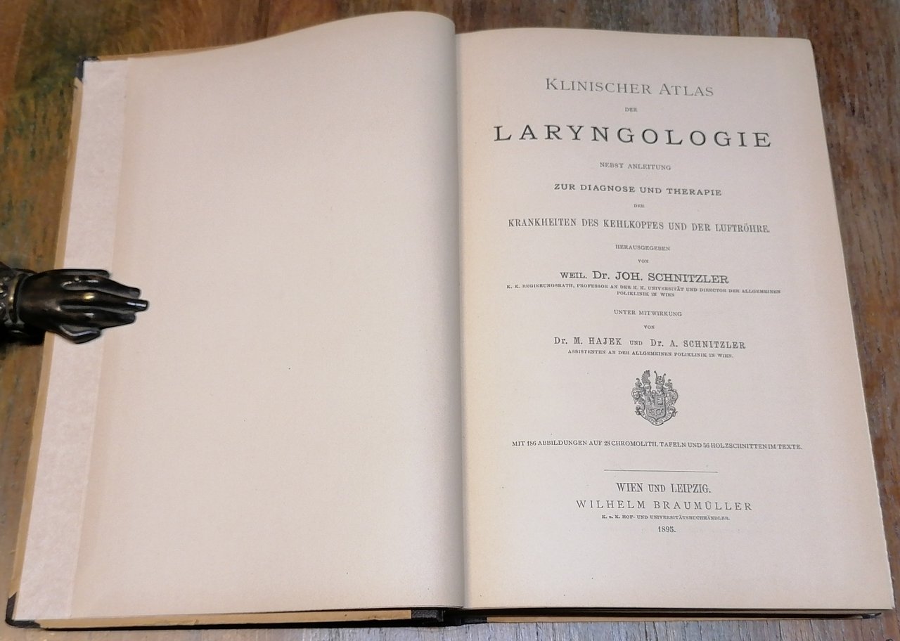 Klinischer Atlas der Laryngologie nebst Anleitung zur Diagnose und Therapie der Krankheiten des Kehlkopfes und der Luftrohre. Herausgegeben von Dr. Johann Schnitzler, unter mitwirkung von Dr. Markus Hajek und Dr. Arthur Schnitzler.