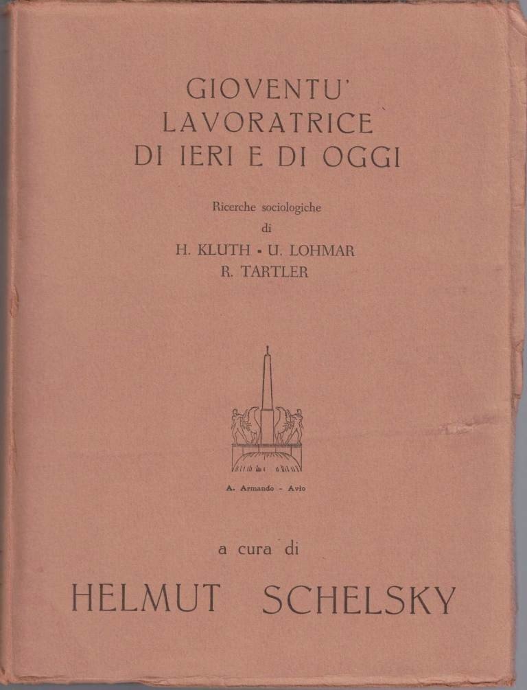 Heinz Kluth, Ulrich Lohmar, Rudolf Tartler, Gioventù lavoratrice di ieri e di oggi. Ricerche sociologiche presentate e pubblicate a cura di Helmut Schelsky dell’Università di Amburgo, Avio Armando Armando Editore, Roma 1958, pp. 415, cm 20, br. ed. Collana I problemi della pedagogia, vol. 24. Titolo originale: Arbeiterjugend gestern und huete. Traduzione di Angela Silvestrelli. Indice: di Helmut Shelsky, Presentazione – Heinz Kluth, La gioventù lavoratrice nella ricerca teoretica e nella problematica (Introduzione – La gioventù lavoratrice nella letteratura del periodo tra le due guerre – La coscienza sociale della gioventù lavoratrice di oggi) – Ulrich Lohmar, La gioventù lavoratrice nelle organizzazioni, nella società e nello Stato (Introduzione – Dal movimento giovanile all’assistenza alla gioventù – L’estraneità dei giovani nella vita sociale) – Rudolfh Tartler, La figura sociale della gioventù di oggi e il rapporto fra le generazioni (Il rapporto fra le generazioni nella sua dipendenza dalla rispettiva struttura sociale – La giovane generazione di oggi) – Conclusioni sul rapporto fra le generazioni ai nostri tempi – Indagine statistica – Indice. Leggere tracce d’uso alla brossura, minime fioriture, lieve brunitura della carta, per il resto perfetto. Intonso.