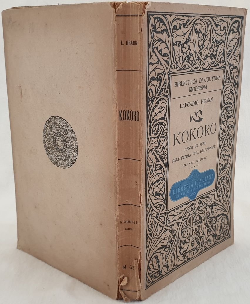 Seconda edizione italiana del 1920 di questo volume sulla vita giapponese di Lafcadio Hearn. Traduzione a cura di Giulio de Georgio. Prefazione di G. De Lorenzo. All'interno: Ad una stazione ferroviaria, Il genio della civilizzazione giapponese, una cantatrice di strada, Da un diario di viaggio, La monaca del tempio d'Amida, Dopo al guerra, Haru, Un barlume delle tendenze, Per forza di karma, Nel crepuscolo degli dei, L'idea della preesistenza, Pensieri sul culto degli antenati, Nel tempo del colera, Kimiko ecc. In buone condizioni. Copertina editoriale in buone condizioni con lievi usure marginali. Legatura in buone condizioni. Pagine in buone condizioni con rare fioriture. In 8. Cm 20,5x13. Pp. XIII+208+(14). Second italian edition of 1920 of this volume about japanese life by Lafcadio Hearn. Translation by Giulio de Georgio. Prefation by G. De Lorenzo. Inside: to a railway station, the genius of japanese civilization, a street singer, From a travel diary, the Monk of the Temple of Amida, After the war, Haru, Am light of tendence, For karma, Idea of pre existance, Thoughts about the cult of ancestors, In the time of Cholera, Kimiko ecc. In good conditions. Editorial cover in good conditions lightly worn in the edges. Binding in good conditions. Pages in good conditions with occasional foxing. In 8. Cm 20,5x13. Pp. XIII+208+(14).