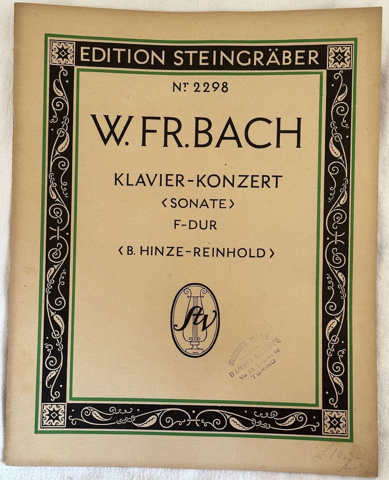 Edizione Steingraber n. 2298 degli anni '30 di questa Melodia per pianoforte "Concerto in Fa Maggiore" del compositore tedesco Johann Sebastian Bach (1685-1750).<BR>In ottime condizioni. Copertina editoriale. In folio. cm. 33,5x26,5. Pp. 27.Steingraber edition n. 2298 of 1930's this musical score of the melody "Concerto in F Major" by the german composer Johann Sebastian Bach (1685-1750). In very good conditions. In folio. cm. 33,5x26,5. Pp. 27.
