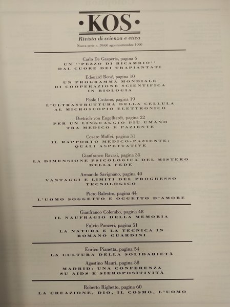 KOS, Rivista mensile, Numero 59/60, Agosto/Settembre 1990. Nuova serie Vol VI. Brossura in carta lucida in buone condizioni. Pagine interne integre, dorso e legatura fermi. Pagine nd.