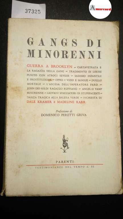 Kramer Dale e Karr Madeline, Gangs di minorenni, Parenti, 1957 - I, in-8, brossura, pp.277. Buone condizioni (normali segni del tempo, lieve foxing sulla copertina)