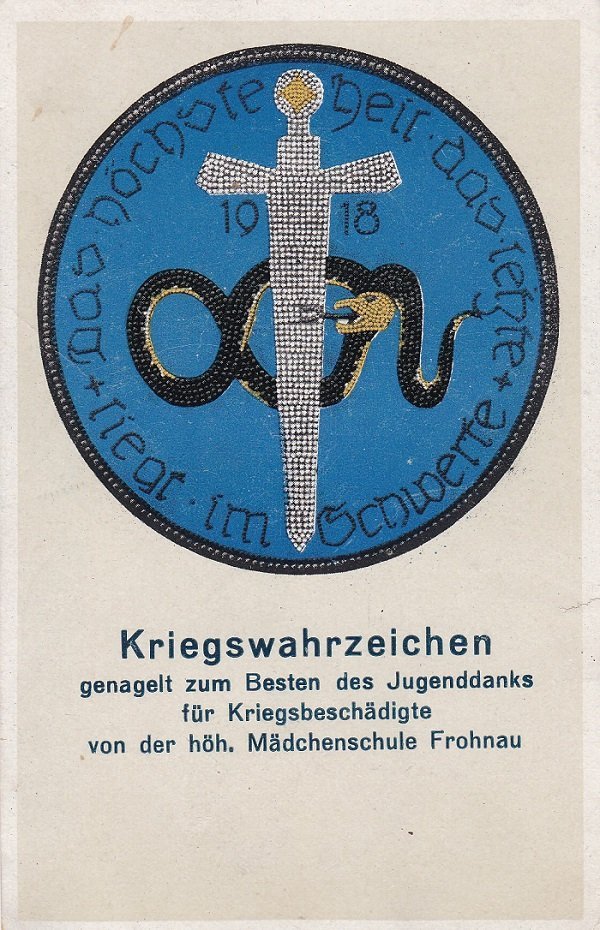 Kriegswahrzeichen genagelt zum Besten des Jugenddanks für Kriegsbeschädigte von der höh. Mädchenschule Frohnau.