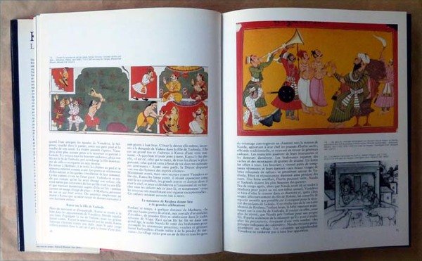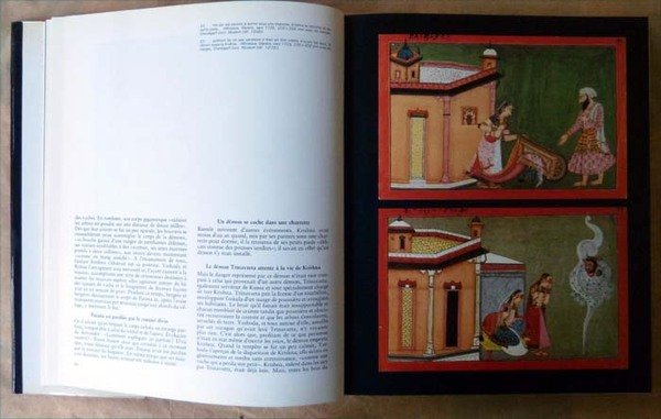 Un volume de format in folio (32x26 cm); de 220 pp. sur beau papier couché; nombreuses et magnifiques illustrations en noir ou en couleurs; reliure de l'éditeur en pleine toile orange; titres en blanc; jaquette illustrée en couleurs. Une division en chapitres aborde les multiples aspects du mythe de Krishna; à savoir: Visions du Seigneur au teint de nuit; Le Récit; L'Elaboration du Mythe; Le Culte; Krishna dans les Arts Plastiques; Krishna dans les Arts Scéniques; Krishna dans la Poésie; ainsi que de d'importantes notes; un glossaire; index, bibliographie. Etat de neuf. Voir les photos. Peu fréquent.