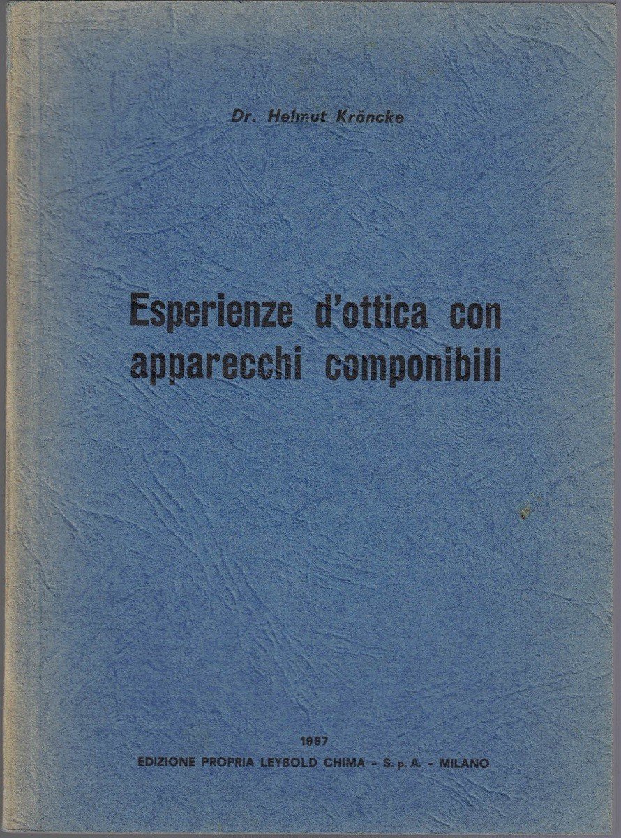 Helmut Kroncke, Esperienze d’ottica con apparecchi componibili, Leybold Chima S.p.A., Milano 1967, pp. IV, 128, ill. b.n., cm 20, br. ed. Titolo originale: Optische versuche mit aufbauteilen. Indice: Introduzione – Elementi componibili – Speciali sorgenti di luce – Alcune osservazioni sulle esperienze di ottica – Ottica geometrica – Lo spettro visibile – Lo spettro ampliato. Fluorescenza e fosforescenza – La visione e i colori – Interferenza della luce – Diffrazione della luce – Polarizzazione della luce – Appendice. Leggera scoloritura al dorso, minima brunitura della carta, per il resto perfetto.