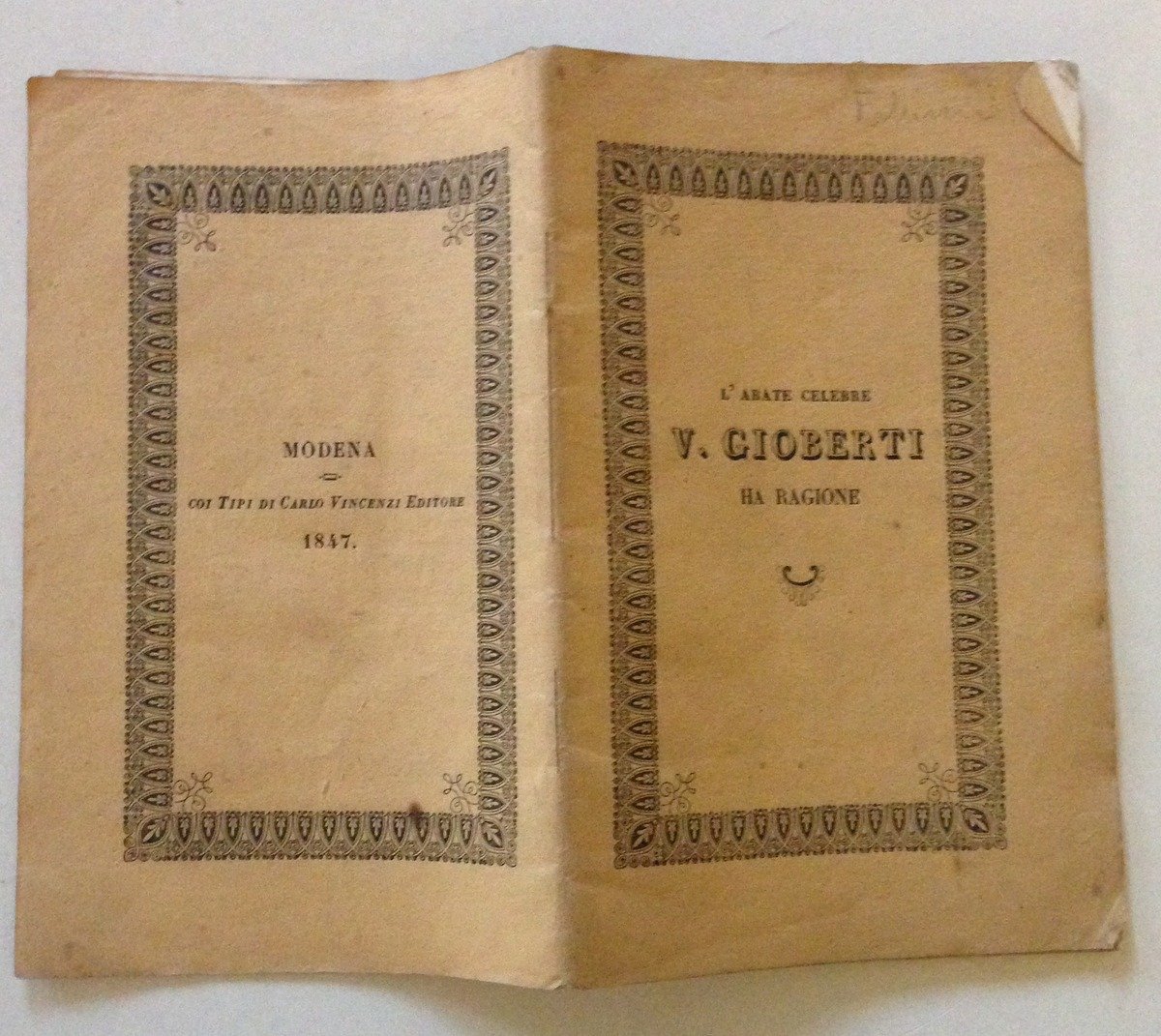 Opuscolo, L'abate celebre Vincenzo Gioberti ha ragione Tip. Carlo Vincenzi Editore, Modena, 1847; cm. 16.5x10.5, pp. 25; ristampa della prima recentissima edizione di Roma; timbro ex proprietà al frontespizio; br. ed. Condizioni di conservazione Esemplare in buono stato con leggere tracce d'uso e del tempo; brossura editoriale con minime macchiette e pieghette; interni con qualche fioritura. OPEB.3743 MT