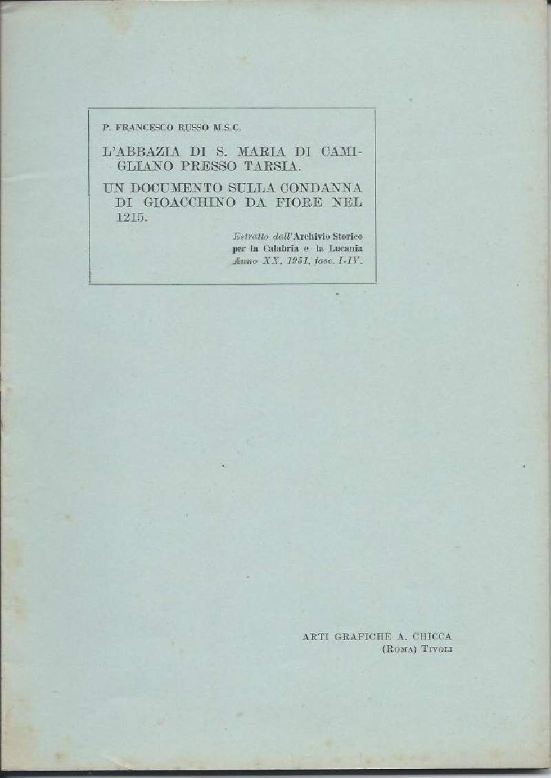 L'ABBAZIA DI S. MARIA DI CAMIGLIANO PRESSO TARSIA - UN DOCUMENTO SULLA CONDANNA DI GIOACCHINO DA FIORE NEL 1215 (1951)