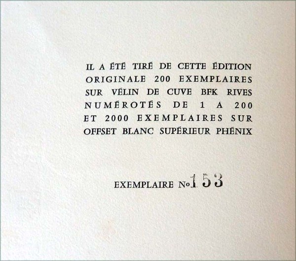 Un volume broché de format in 8° de 254 pp.; nombreuses illustrations in et hors texte par Schem. Non rogné; Bel état. Tirage limité; celui-ci N°153/ 200 sur vélin de cuve BFK Rives (premier papier); tirage total à 2000 ex. Voir les photos.