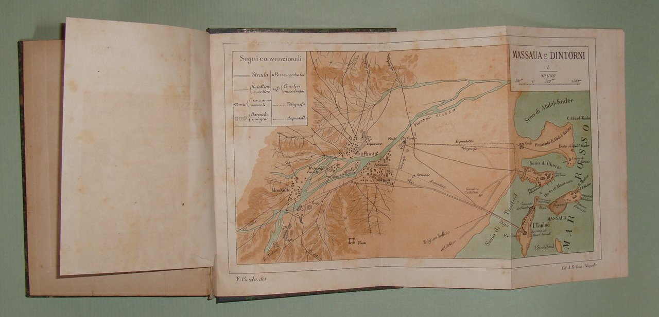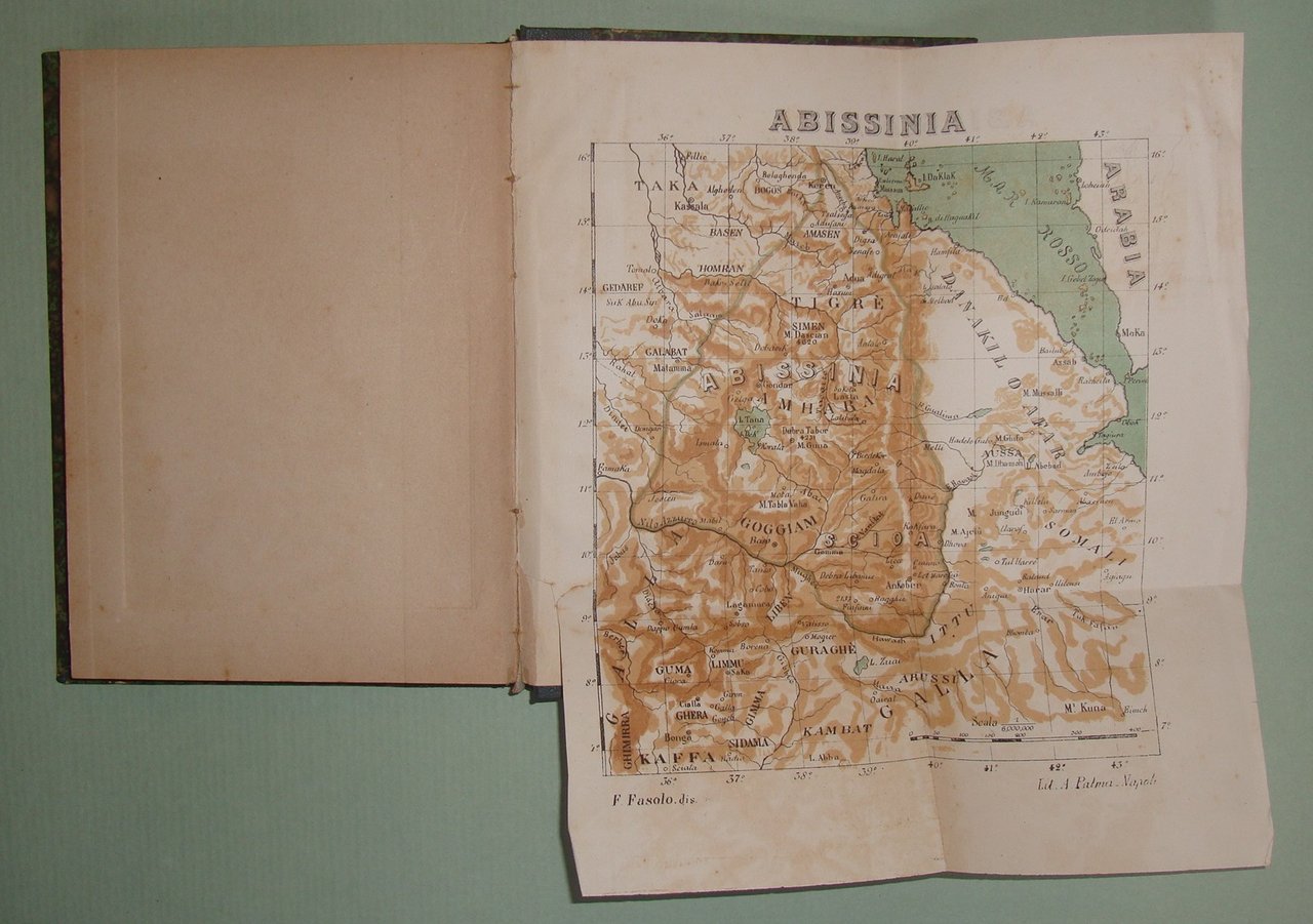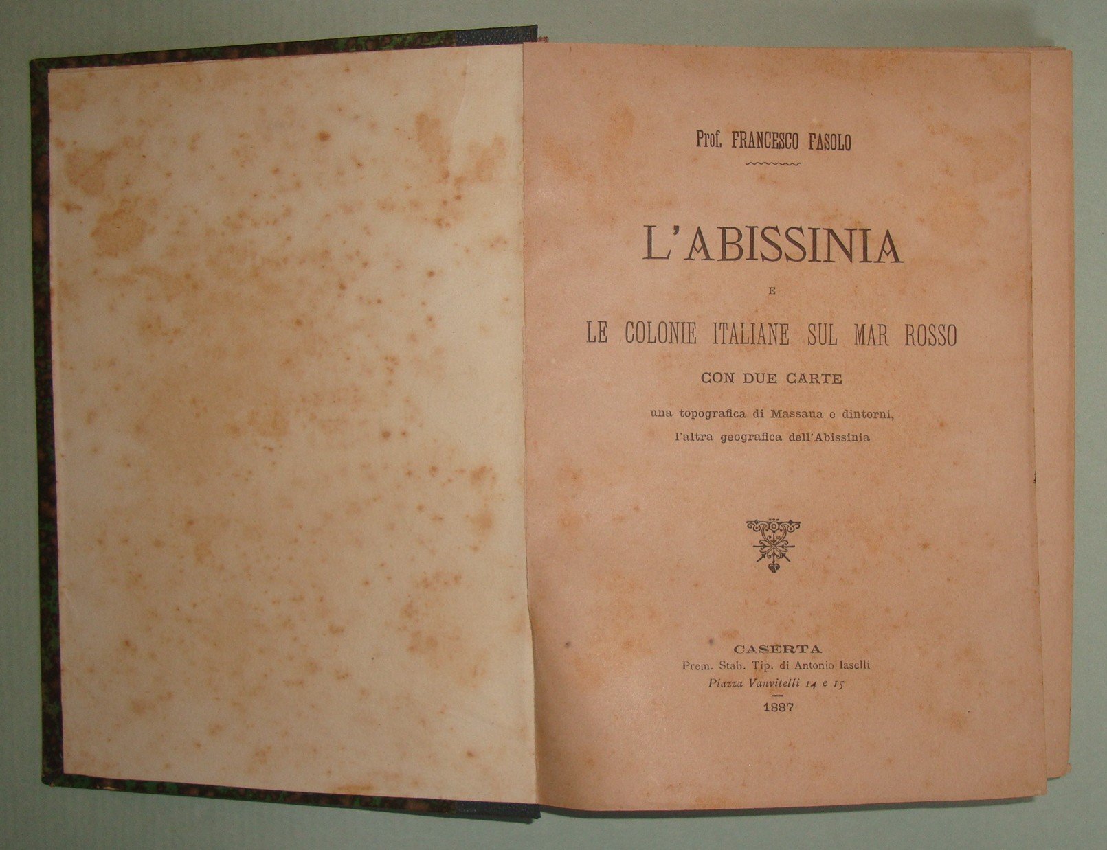 FASOLO Francesco. L'Abissinia e le colonie italiane nel Mar Rosso. Con due carte, una topografica di Massaua e dintorni, l’altra geografica dell'Abissinia. Caserta, Iaselli, 1887. In 16mo; pp.273, 1n.n. Firma dell'autore. Mezza tela.