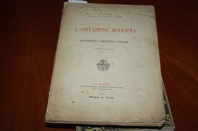 L'ABITAZIONE MODERNA G.LANDI MODENA 1900, , COD 4581, 85 p., 6 tav. f.t.; 24 cm. Bross. edit. Dorso rifatto, qualche fioritura sulla copertina e nel testo. Con riferimenti al nuovo quartiere Alessandro Rossi a Schio
