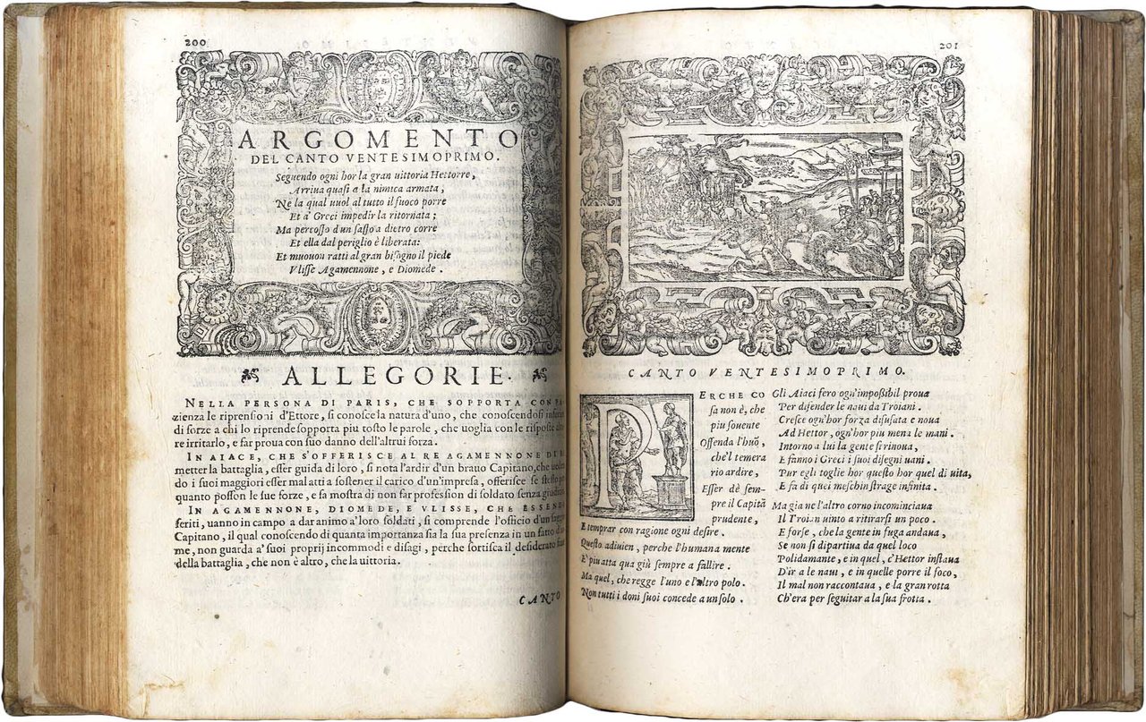 >in-4, ff. (14), pp. 544, ff. (22) per l'Oratione di Menechini con frontespizio proprio. Carattere corsivo italico su due colonne, legatura ottocentesca in piena pergamena rigida, titolo su tassello al dorso. Illustrato in xilografia: imprese del Giolito sui due titoli, ritratto dell'autore in ricca bordura a piena pag., 55 vignette su mezza pagina, testate e finalini, grandi iniziali istoriate. Edizione originale, terza tiratura senza varianti salvo la data 1572 (preceduta da le due tirature con data 1570 e 1571 sui titoli). Importante e rara opera poetica. Buon esemplare, con rare arrossature, strappo restaurato al foglio di titolo. Gamba 1359. Bongi, II, 308. Mortimer, I, 159. Olschki, Choix, n.4459.
