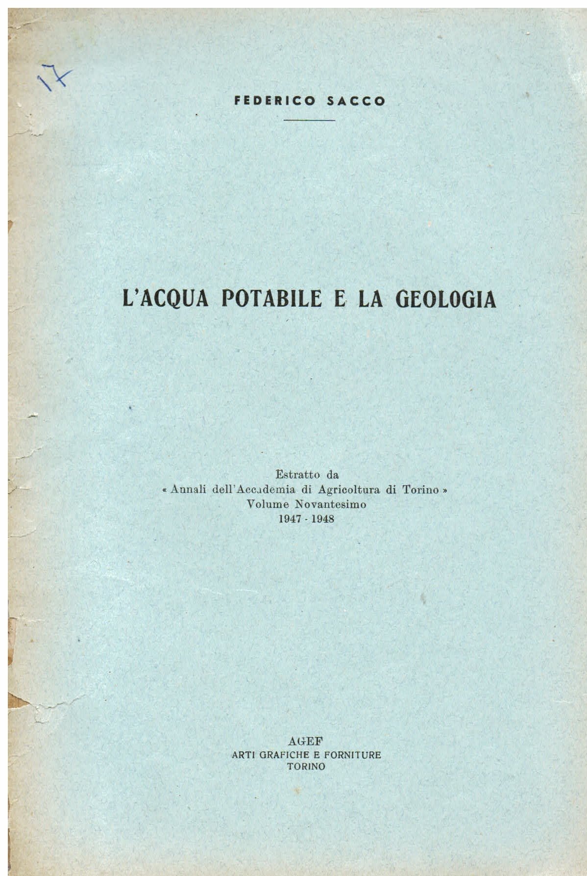 L'acqua potabile e la geologia. Estratto da 'Annali dell'Accademia di Agricoltura di Torino'. Volume Novantesimo 1947 - 1948