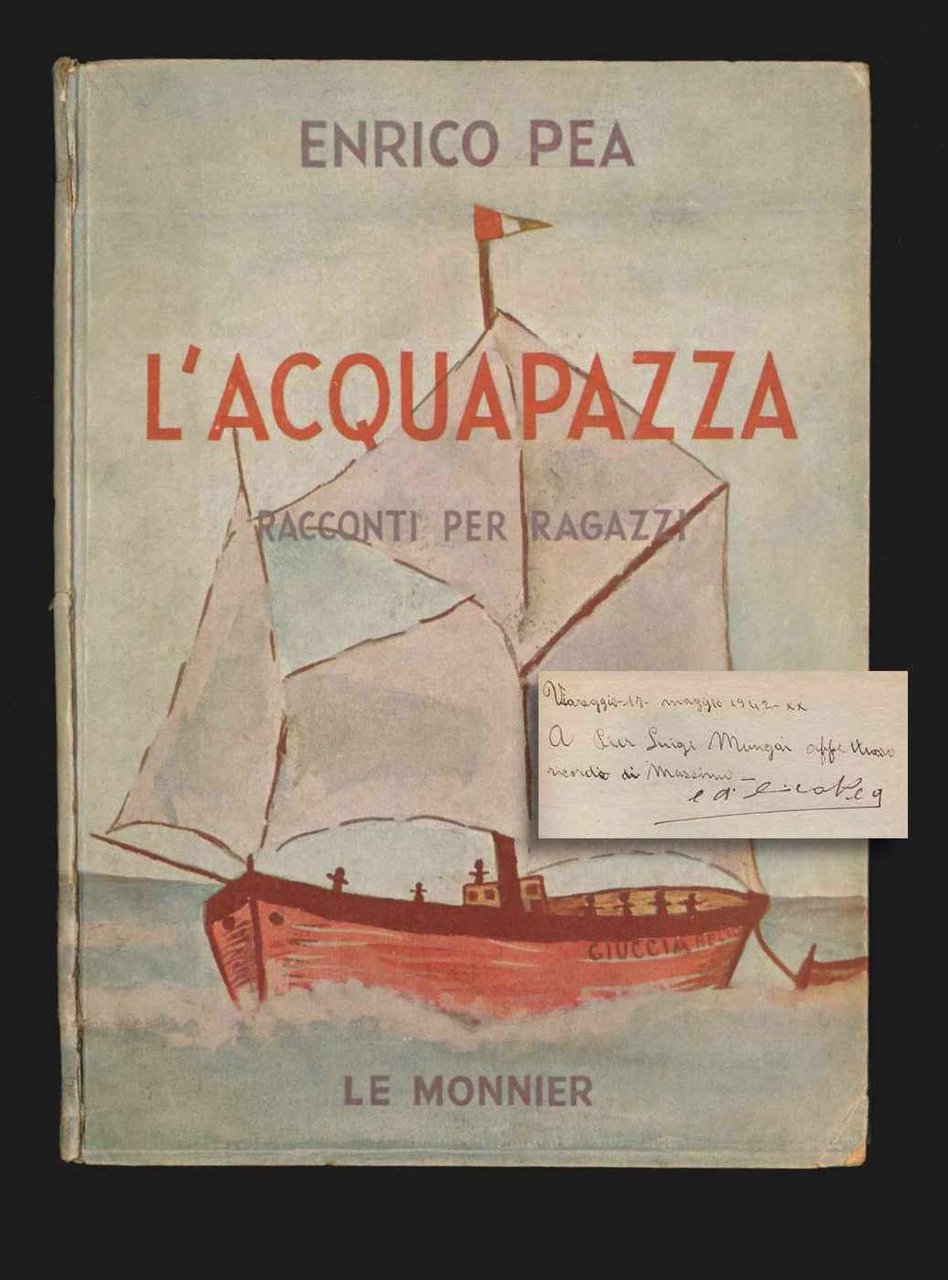 LIBRO Prima edizione. CON AUTOGRAFO. Piccole imperfezioni al dorso e al piatto posteriore, nel complesso un ottimo esemplare. Dedica autografa di Massimo Bellora e firma autografa di Enrico Pea. Raccolta di racconti per ragazzi, tutti tratti da opere dello stesso Pea con note a piè pagina che spiegano il significato di alcune parole o espressioni. Le undici tavole di Bellora rappresentano momenti specifici di altrettanti racconti.