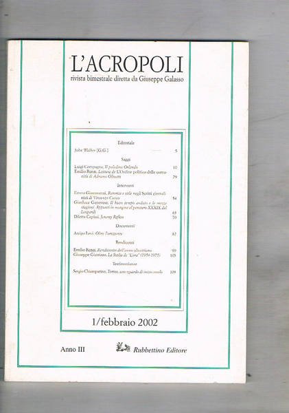 L'Acropoli rivista bimestrale. n° 1 febb. 2002. di Capuana L. il paladino Orlando; Grammattei retorica e stile negli scritti giornalistici di Vincenzo Cuoco; ecc.